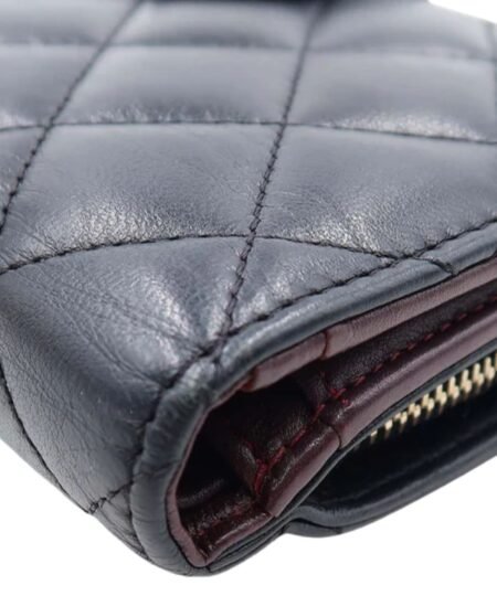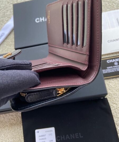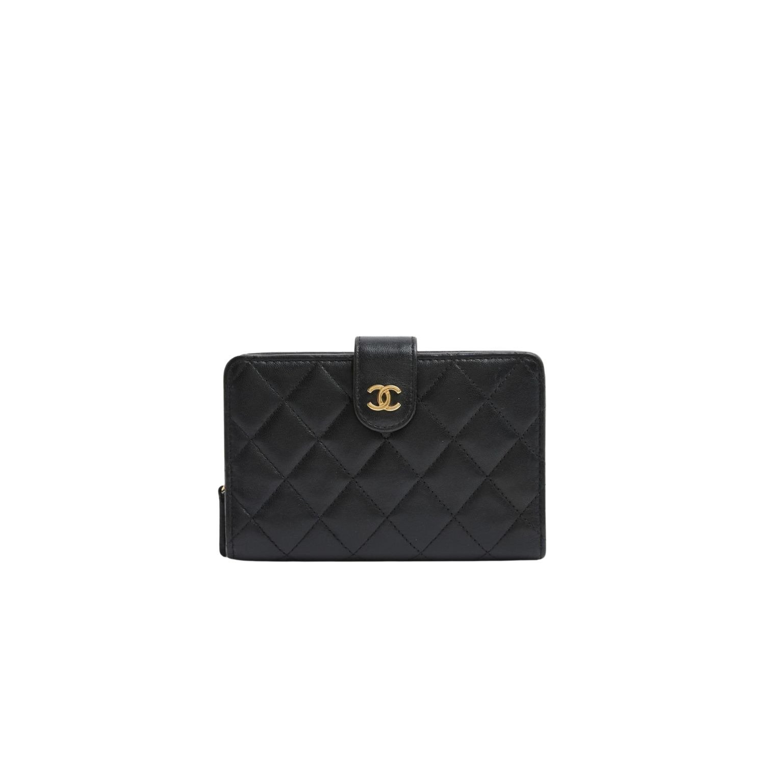 CC Lambskin Wallet is flap and snap fastening with gold-tone interlocking CC logo at front. Multiple compartiments. Flat pocket at back. Zip closure. Gold metal hardware. With dust bag, authenticity card and care guide.
