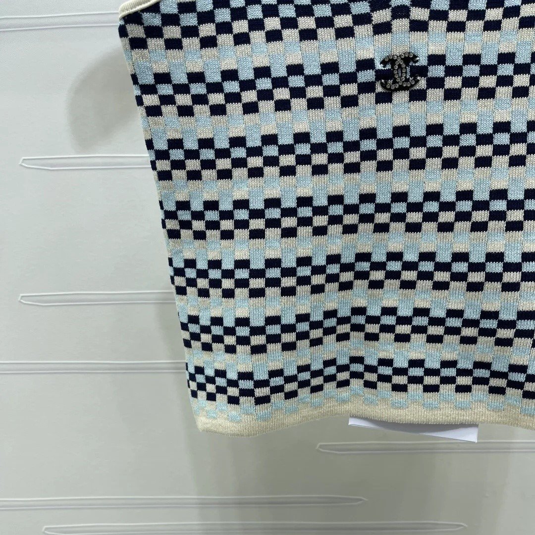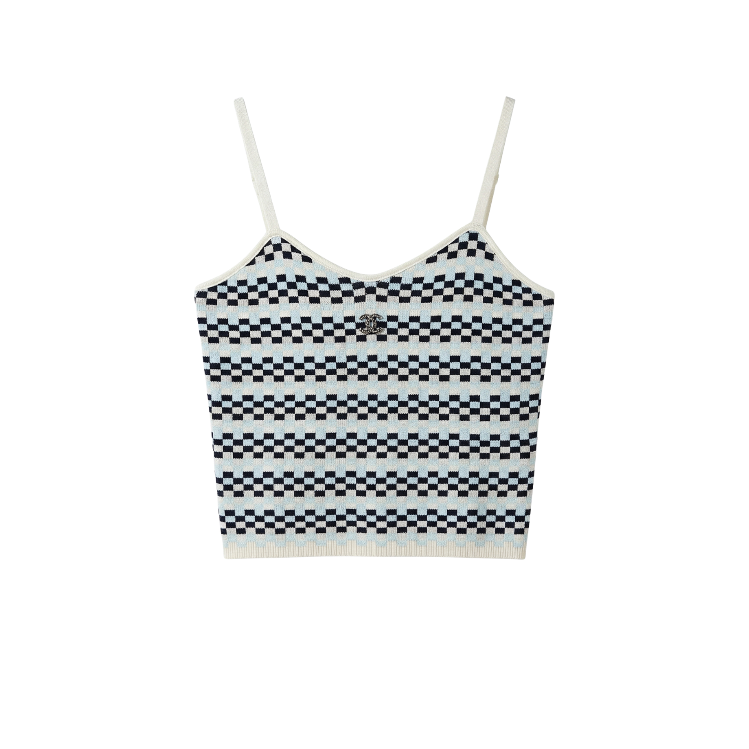 This chic, sleeveless camisole offers a playful and modern take on Chanel’s classic knitwear. Featuring a vibrant graphic pattern, it is the perfect statement piece for high-fashion summer styling.