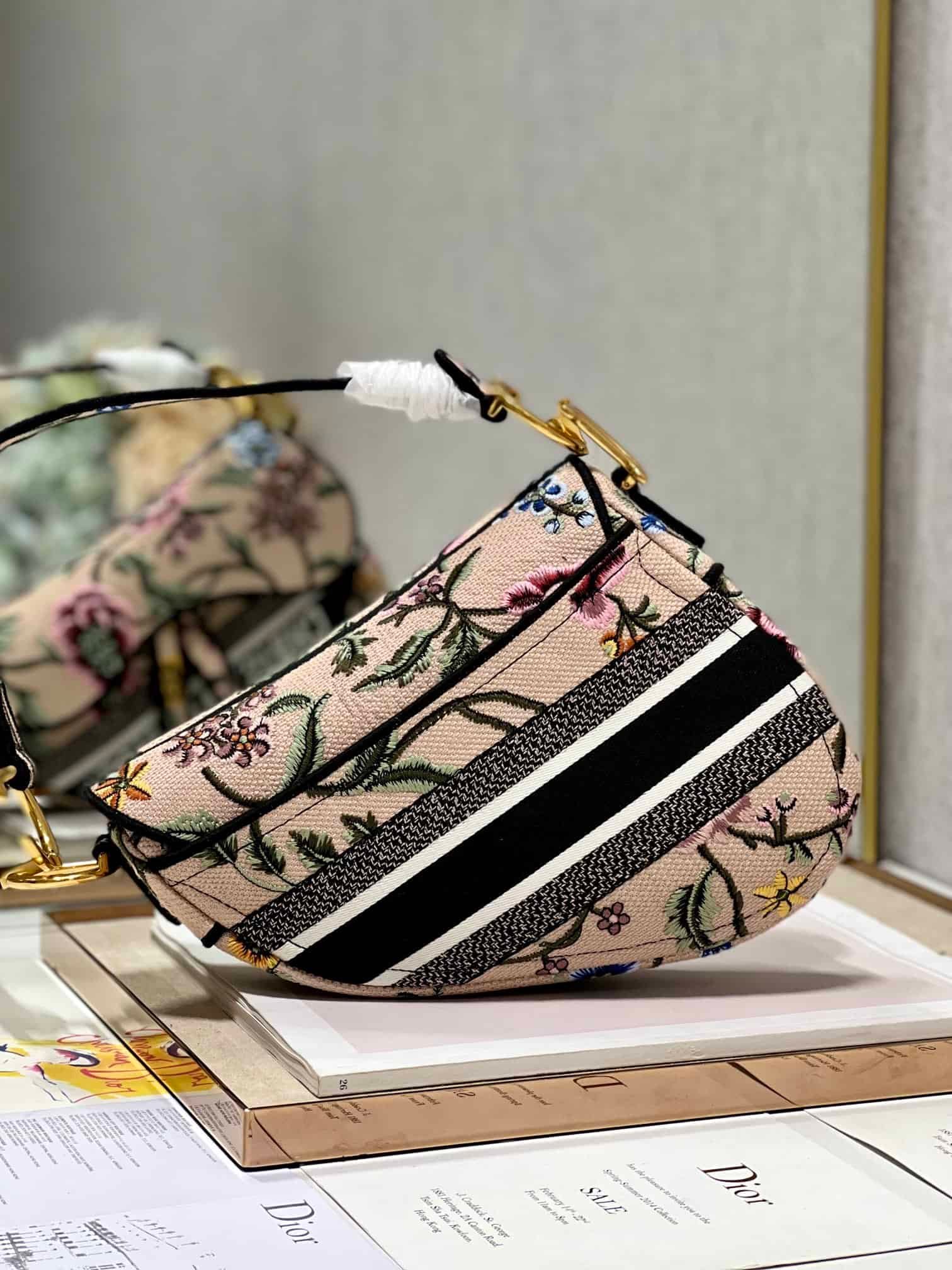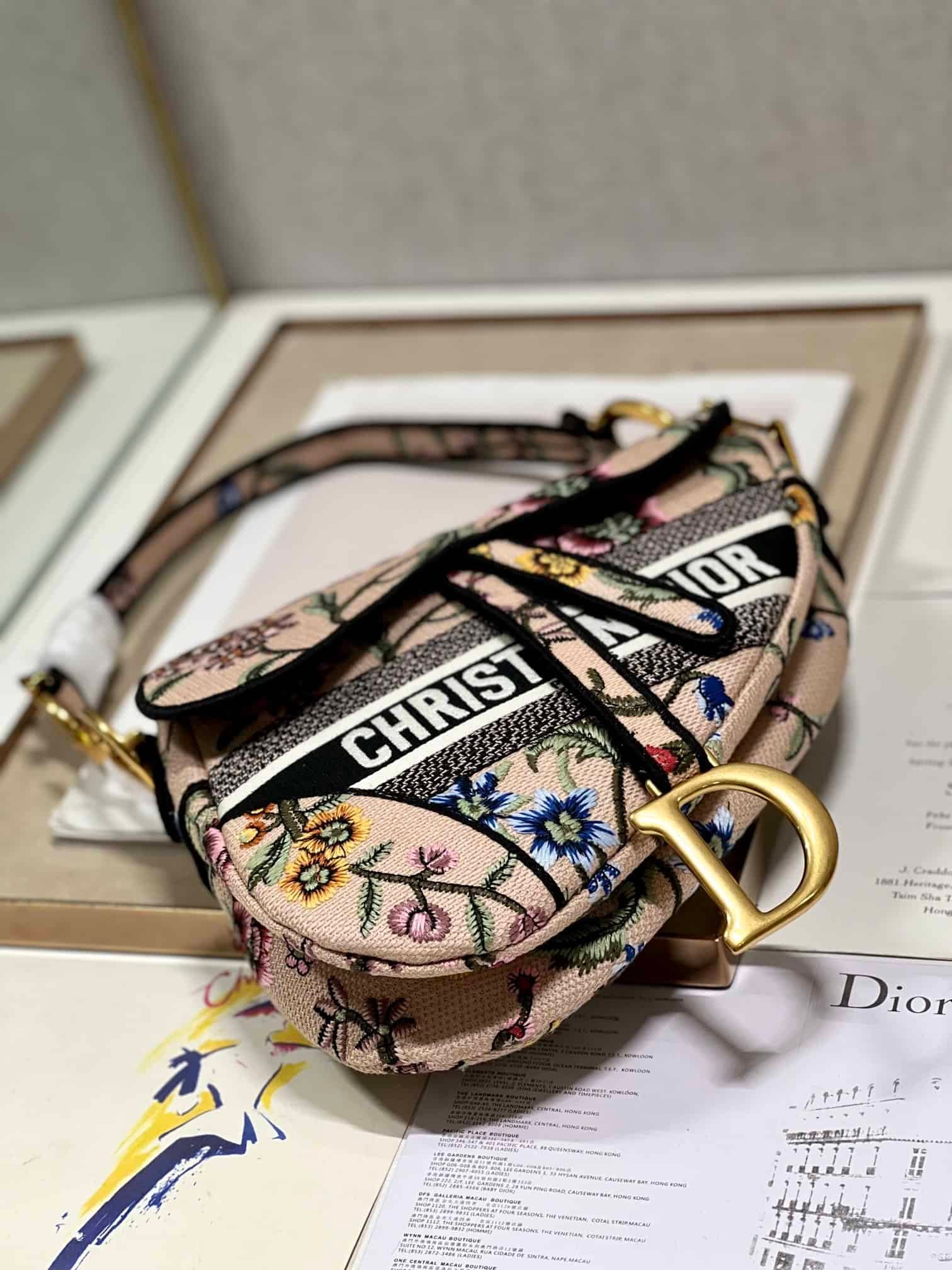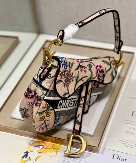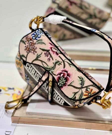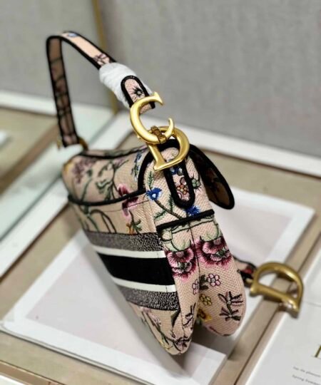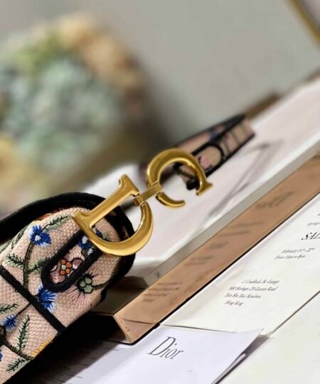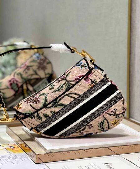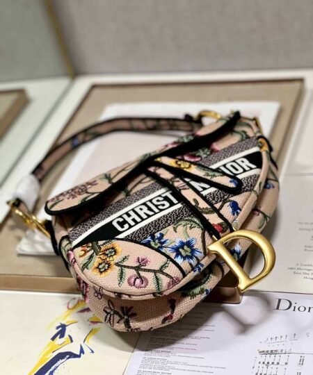Maria Grazia Chiuri brings a fresh update to the iconic Saddle bag. The design is fully embroidered with a white multicolor Dior Petites Fleurs motif, a romantic and vibrant homage to Mr. Dior’s passion for florals. The legendary style features a Saddle flap with a magnetic D stirrup clasp and an antique gold-finish metal CD signature on each side of the handle. The bag can be carried by hand or worn over the shoulder, may be customized with different shoulder straps, and can be paired with other Dior Petites Fleurs creations.