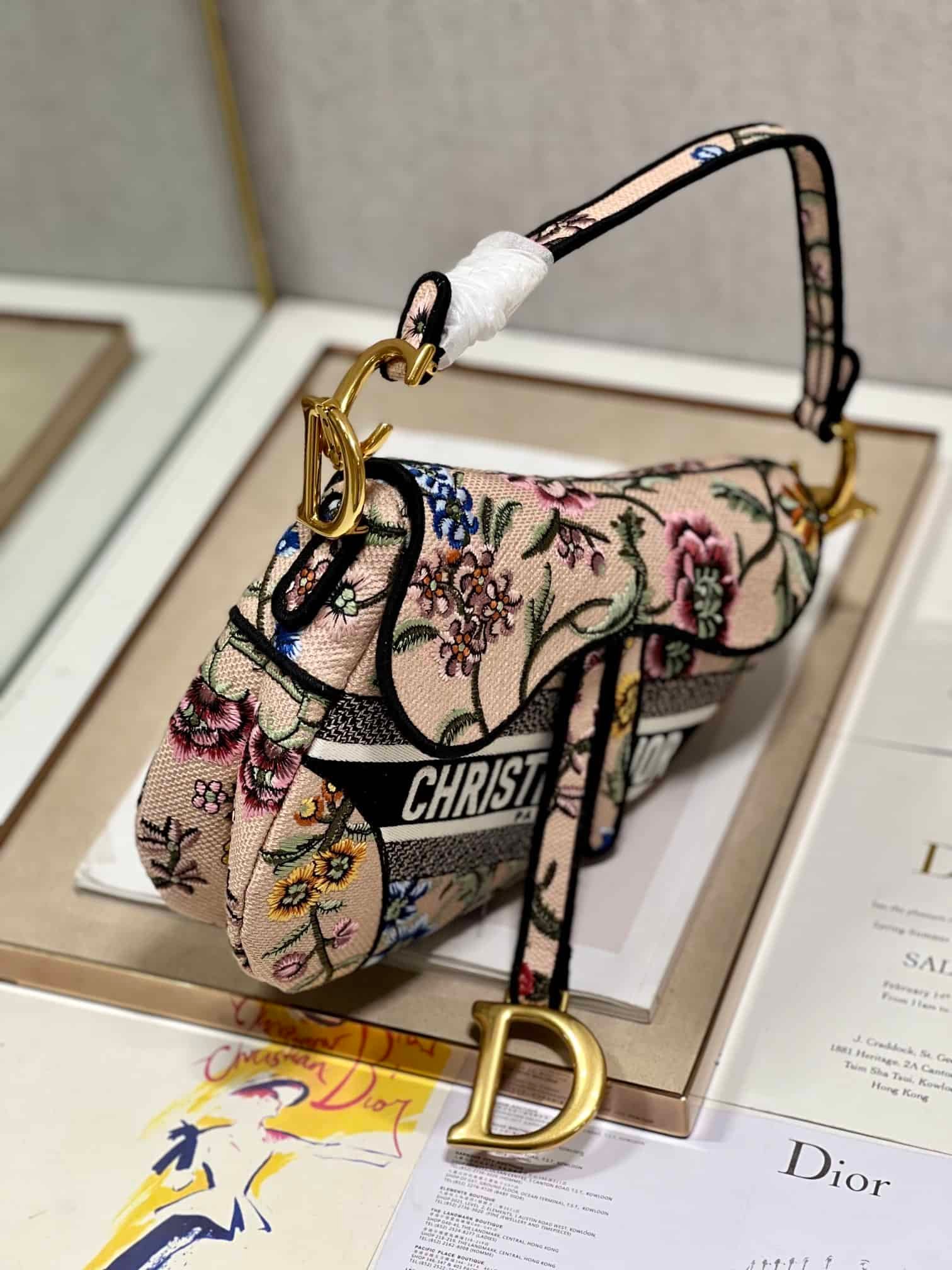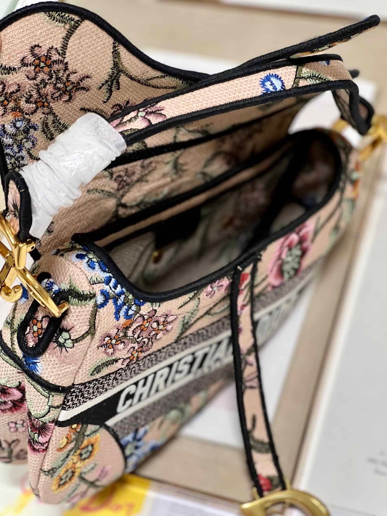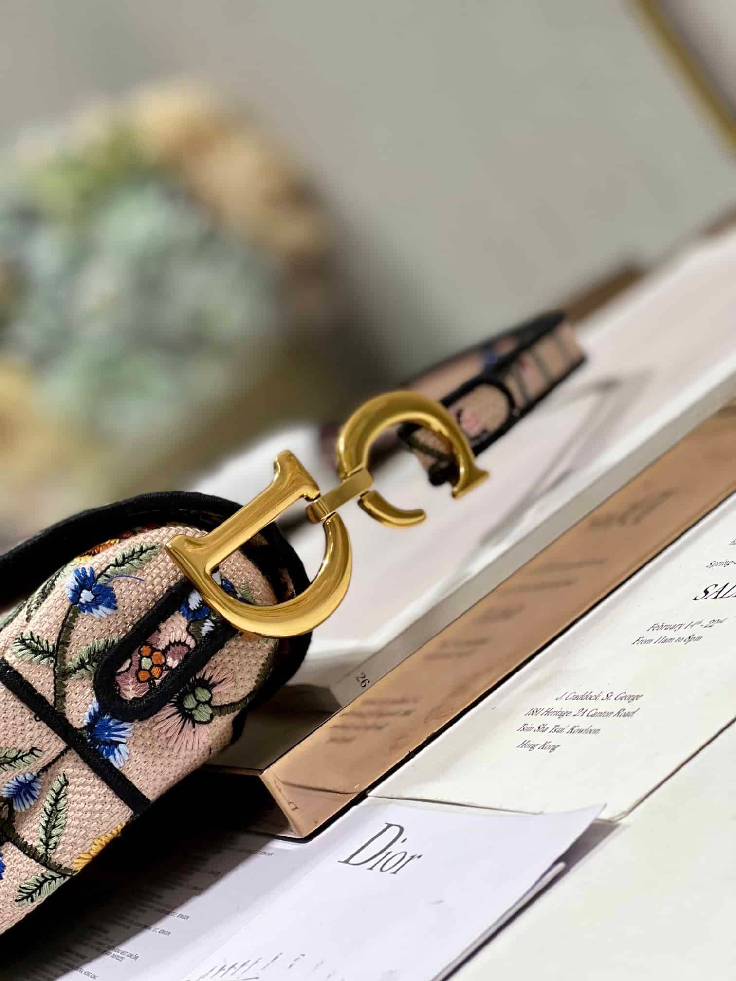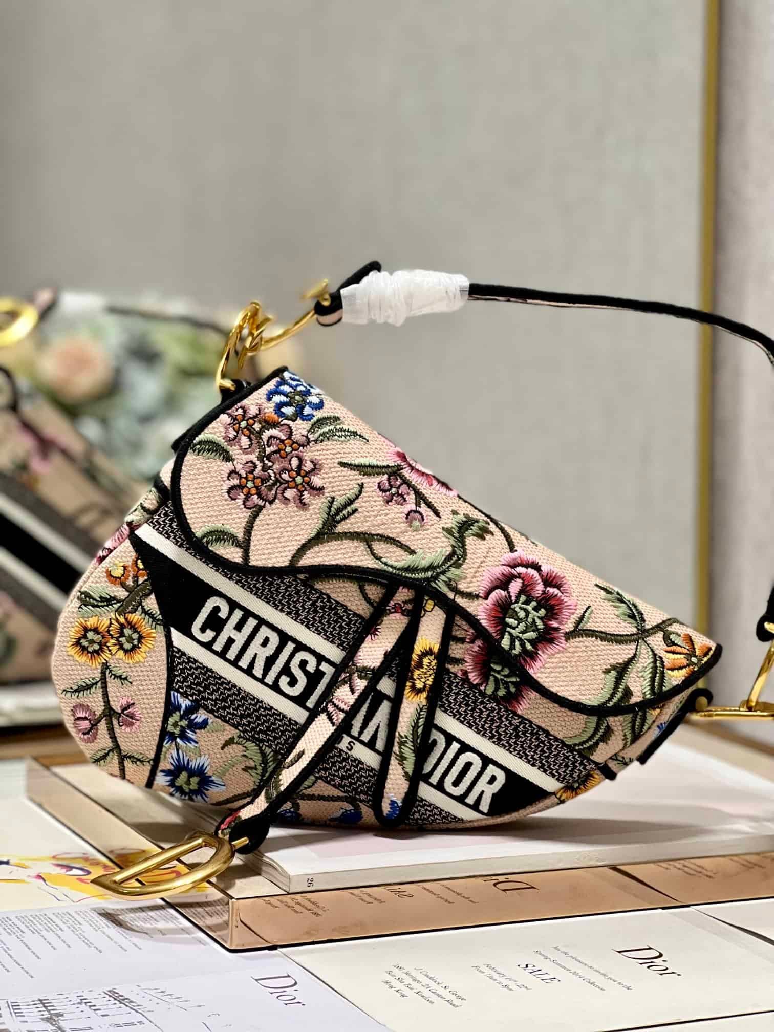 Maria Grazia Chiuri brings a fresh update to the iconic Saddle bag. The design is fully embroidered with a white multicolor Dior Petites Fleurs motif, a romantic and vibrant homage to Mr. Dior’s passion for florals. The legendary style features a Saddle flap with a magnetic D stirrup clasp and an antique gold-finish metal CD signature on each side of the handle. The bag can be carried by hand or worn over the shoulder, may be customized with different shoulder straps, and can be paired with other Dior Petites Fleurs creations.