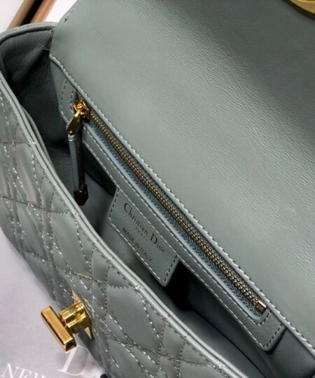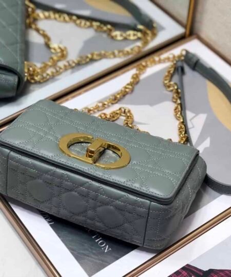 The Dior Caro bag combines modernity with timeless elegance. The design is crafted in gray supple with Cannage stitching. The bag features a flap adorned with an antique gold-finish metal ‘CD’ twist clasp, inspired by the seal of a Christian Dior perfume bottle. The detachable chain shoulder strap with ‘CD’ signature links allows it to be carried by hand, over the shoulder or crossbody, or replaced by one of the House’s wide embroidered straps, allowing the small bag to pair with day or evening attire.