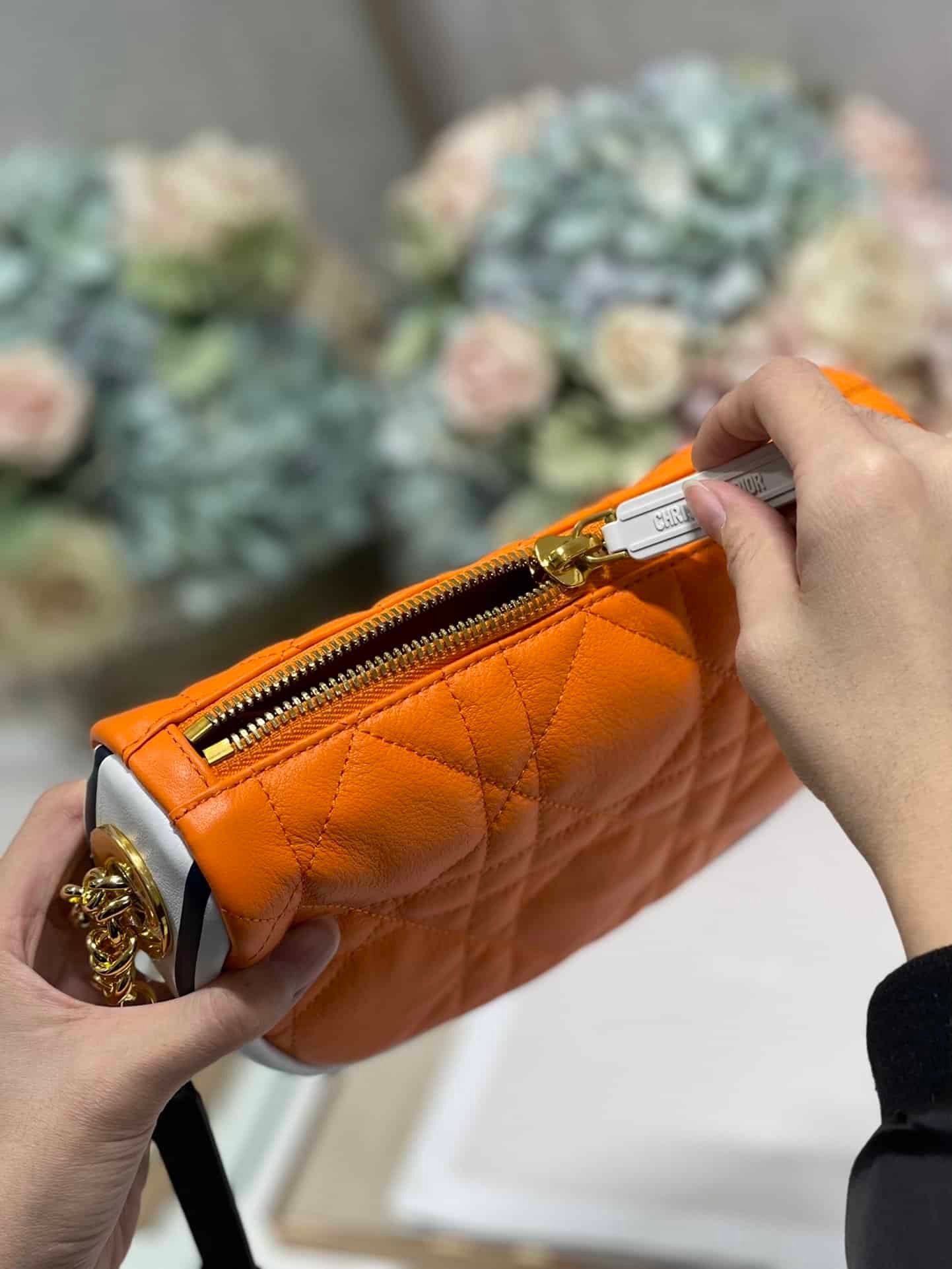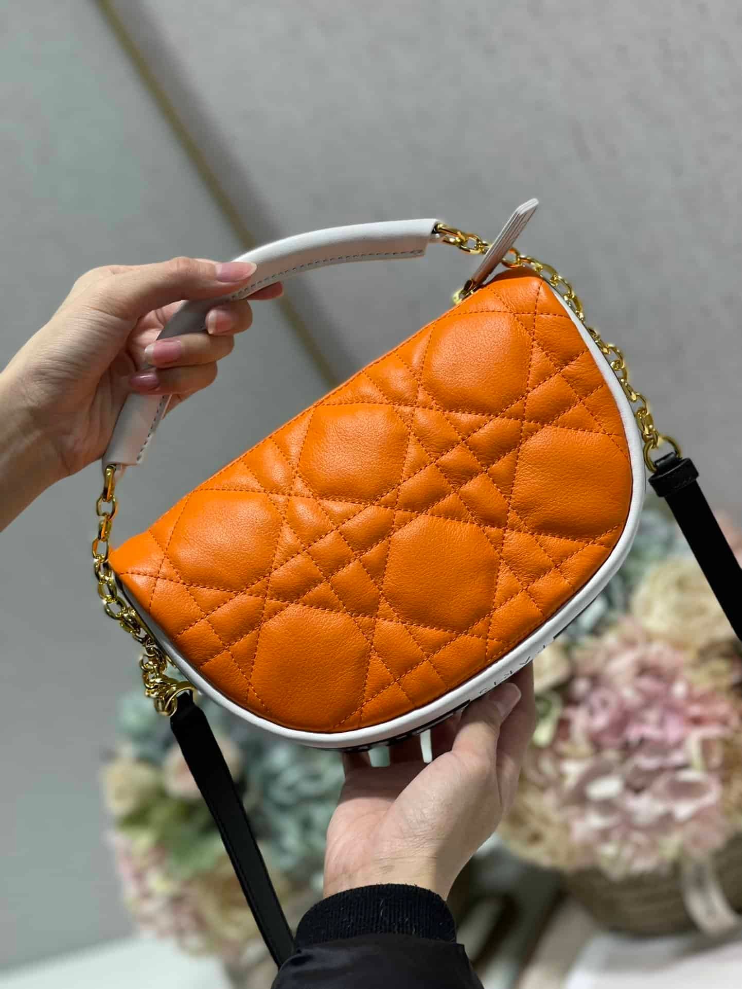 Maria Grazia Chiuri’s Dior Vibe bag modernizes the allure of a Hobo style with modern lines while embodying the collection’s colorful pop universe. Crafted in fluorescent orange Macrocannage, the bag has a black ‘CHRISTIAN DIOR PARIS’ signature adorns the bottom of the bag. Featuring a handle in addition to a removable and adjustable shoulder strap with a military-inspired buckle, the small Dior Vibe bag can be carried by hand, worn over the shoulder or crossbody for a sportier look.