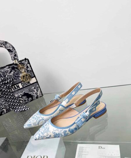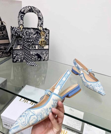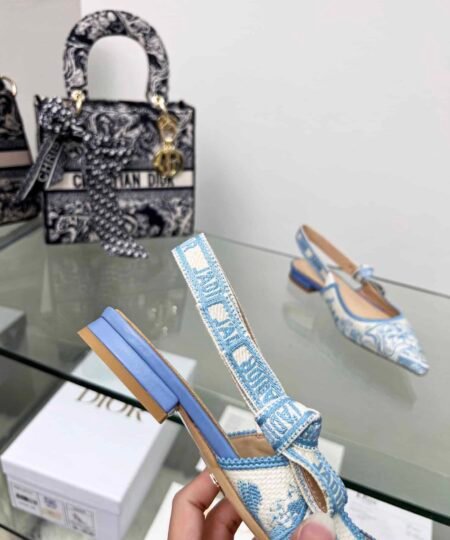 The J’Adior slingback pump is a prime example of Dior savoir-faire. The design showcases the Toile de Jouy motif. The two-tone ‘J’ADIOR’ signature on the embroidered cotton ribbon, bow and 2 cm (0.7) comma heel complete the refined and elegant style, which pairs well with other creations.