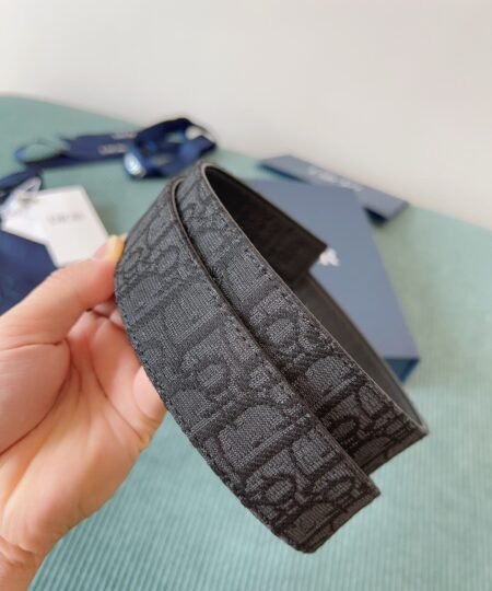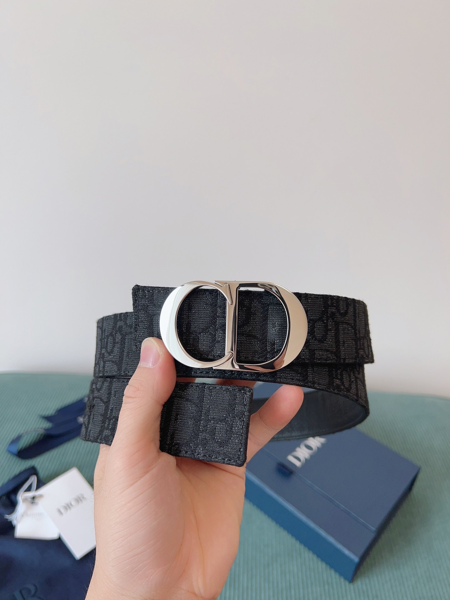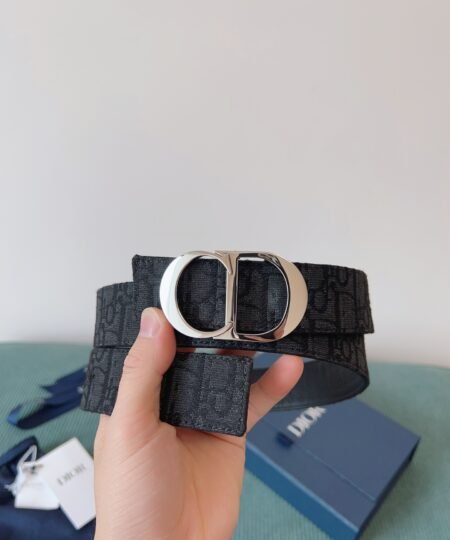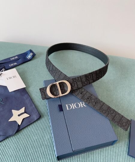 - Inspired by the hallmark namesake bag, the 30 Montaigne belt is offered in a reversible variation, thanks to its swivel feature. Crafted in smooth calfskin on one side and blue Dior Oblique jacquard on the other, it is embellished with the iconic shiny gold-finish metal ‘CD’ buckle. The design also features two removable loops that can be worn either tonal or in a contrasting color. The timeless accessory elegantly highlights the waist and will coordinate well with jeans, a skirt or a dress