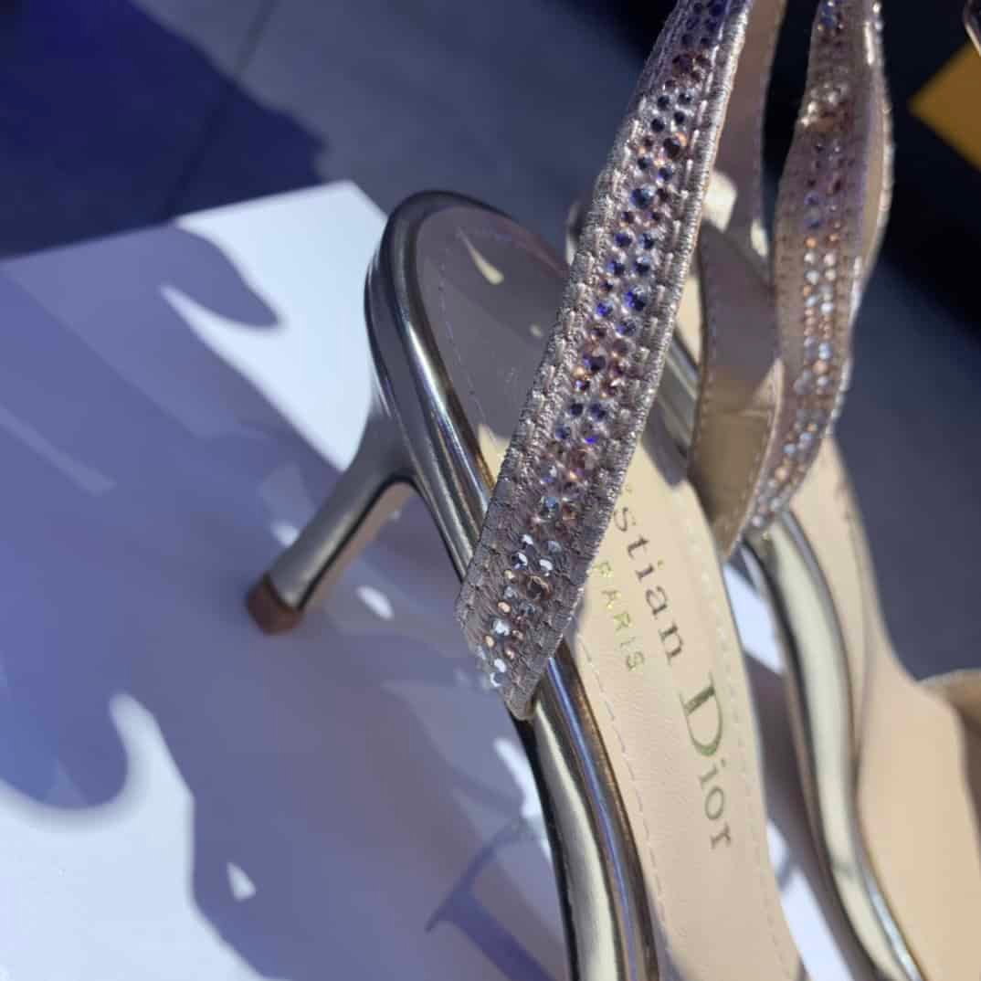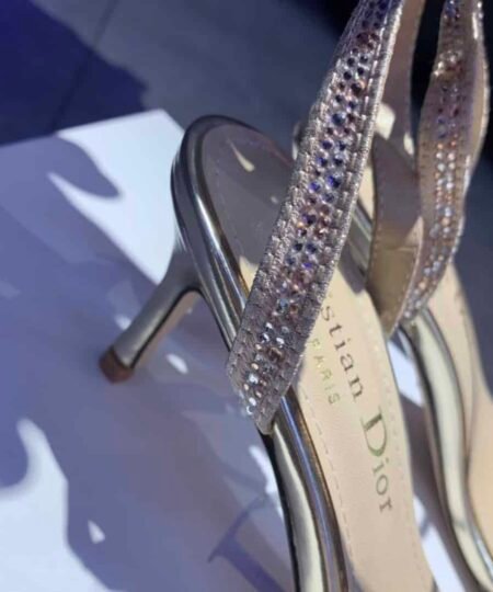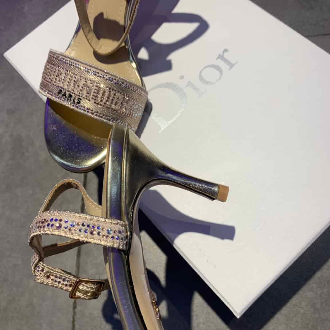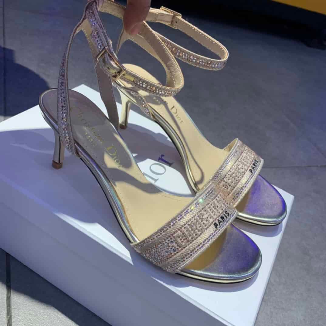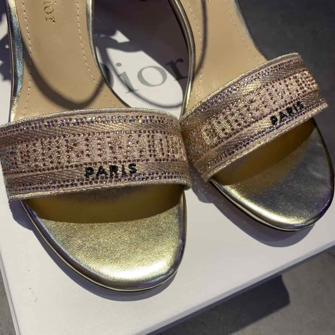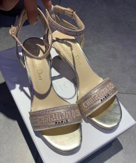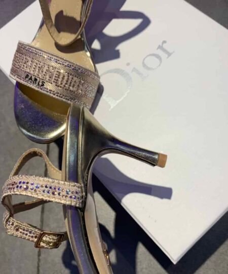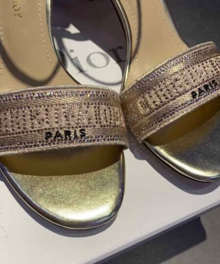 - CD Dway Heeled Sandal is elegantly reimagines one of the House’s hallmark creations. Crafted embroidered with metallic thread and further adorned with gold-tone strass, it is distinguished by a play on delicate straps revealing an embroidered ‘CHRISTIAN DIOR’ signature on the upper. Completed by a 6.5 cm (2.5″) heel, the exceptional shoe is ideal for formal attire.