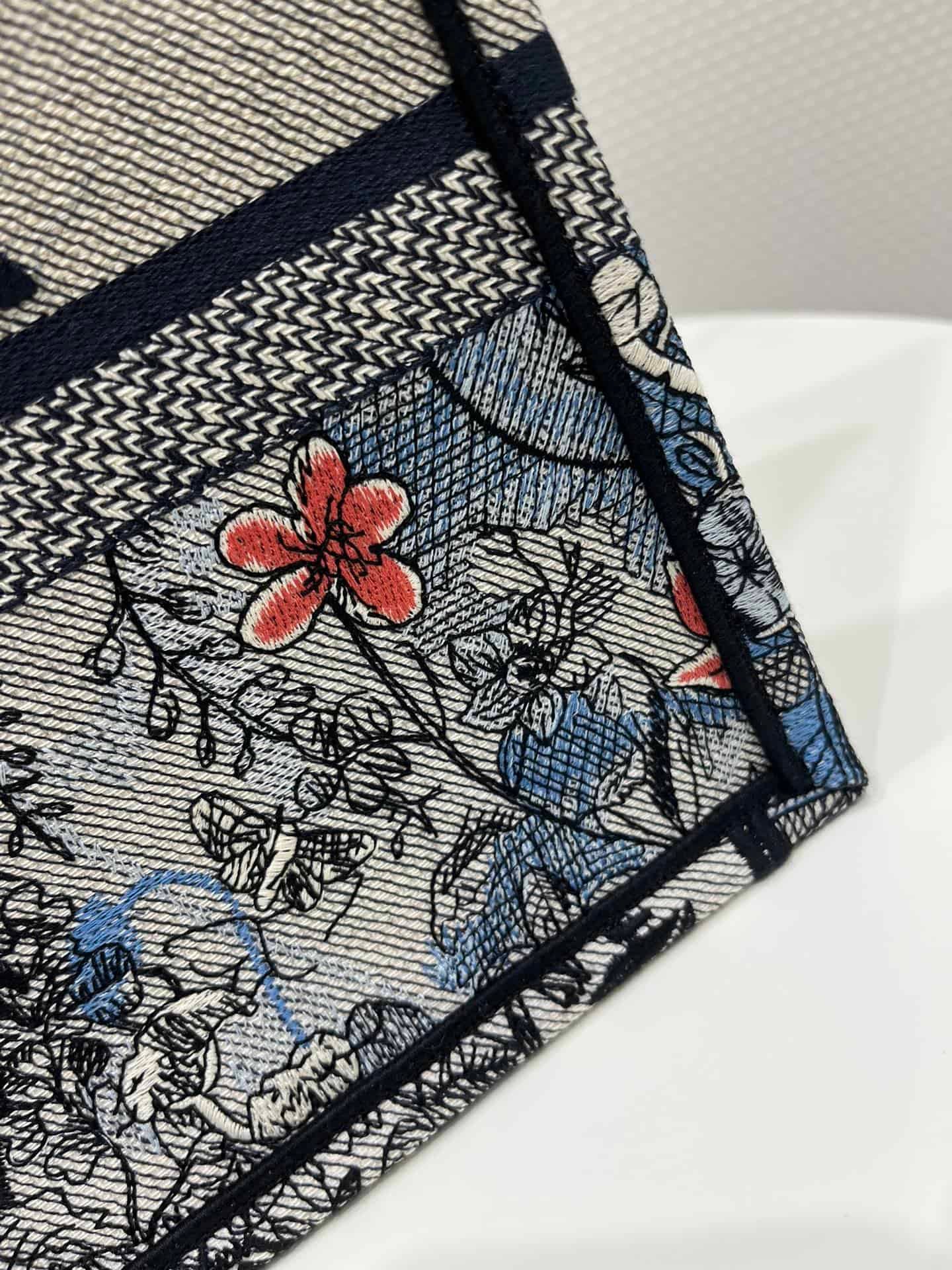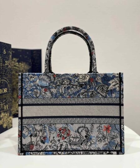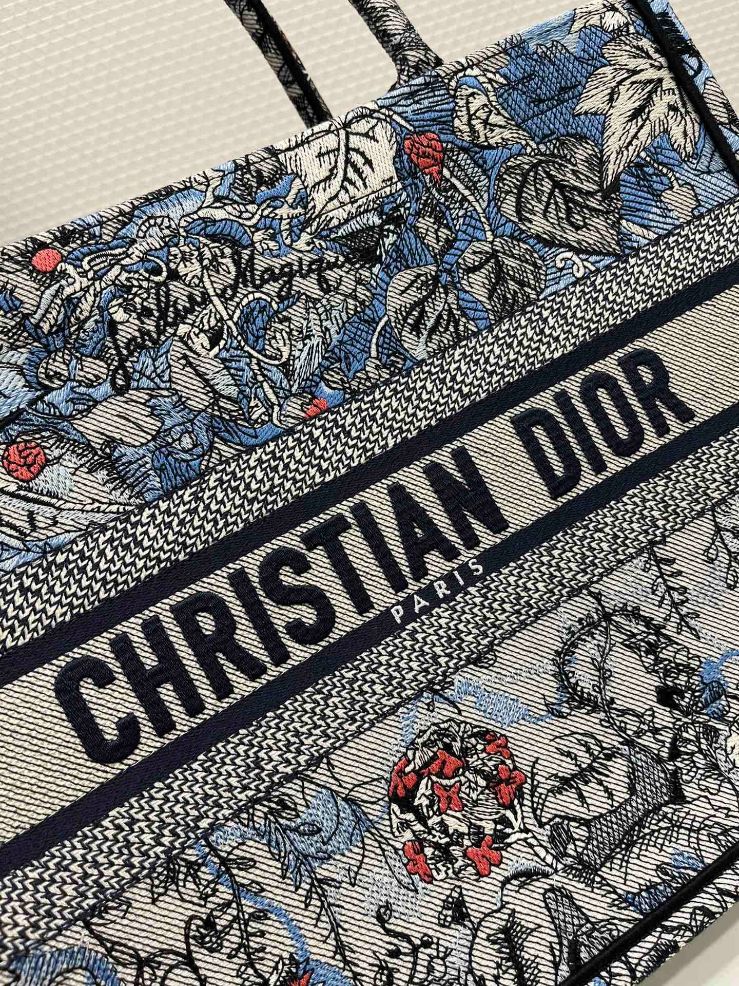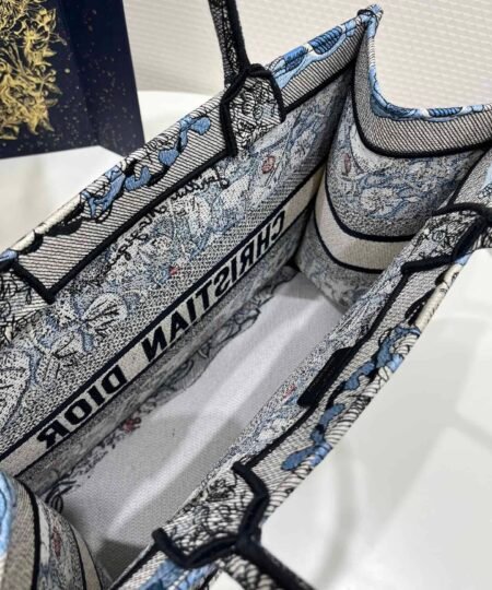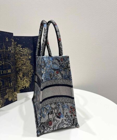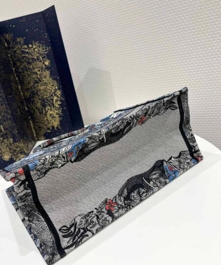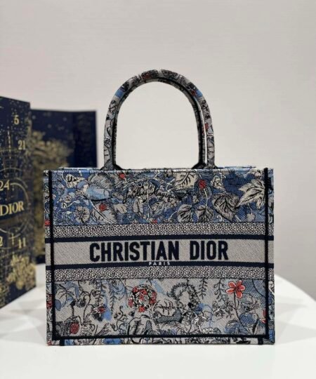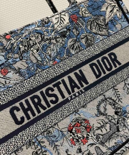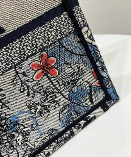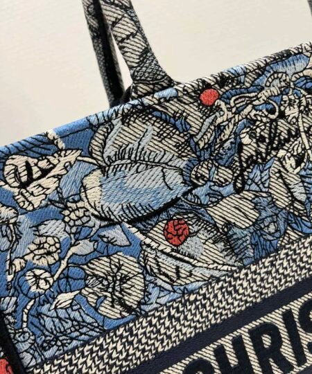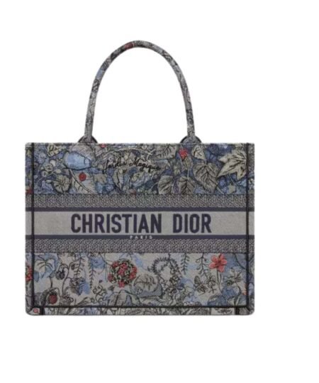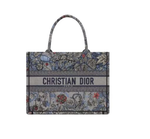 Introduced by Maria Grazia Chiuri, Dior’s Creative Director, the Dior Book Tote has become a staple of the Dior aesthetic. Designed to hold all the daily essentials, the style is fully embroidered with the denim multicolor Dior Jardin Magique motif, a bucolic and enchanting creation inspired by a magical world. The design is adorned with the ‘CHRISTIAN DIOR PARIS’ signature on the front and exemplifies the House’s signature savoir-faire. The medium tote may be carried by hand or worn over the shoulder.
