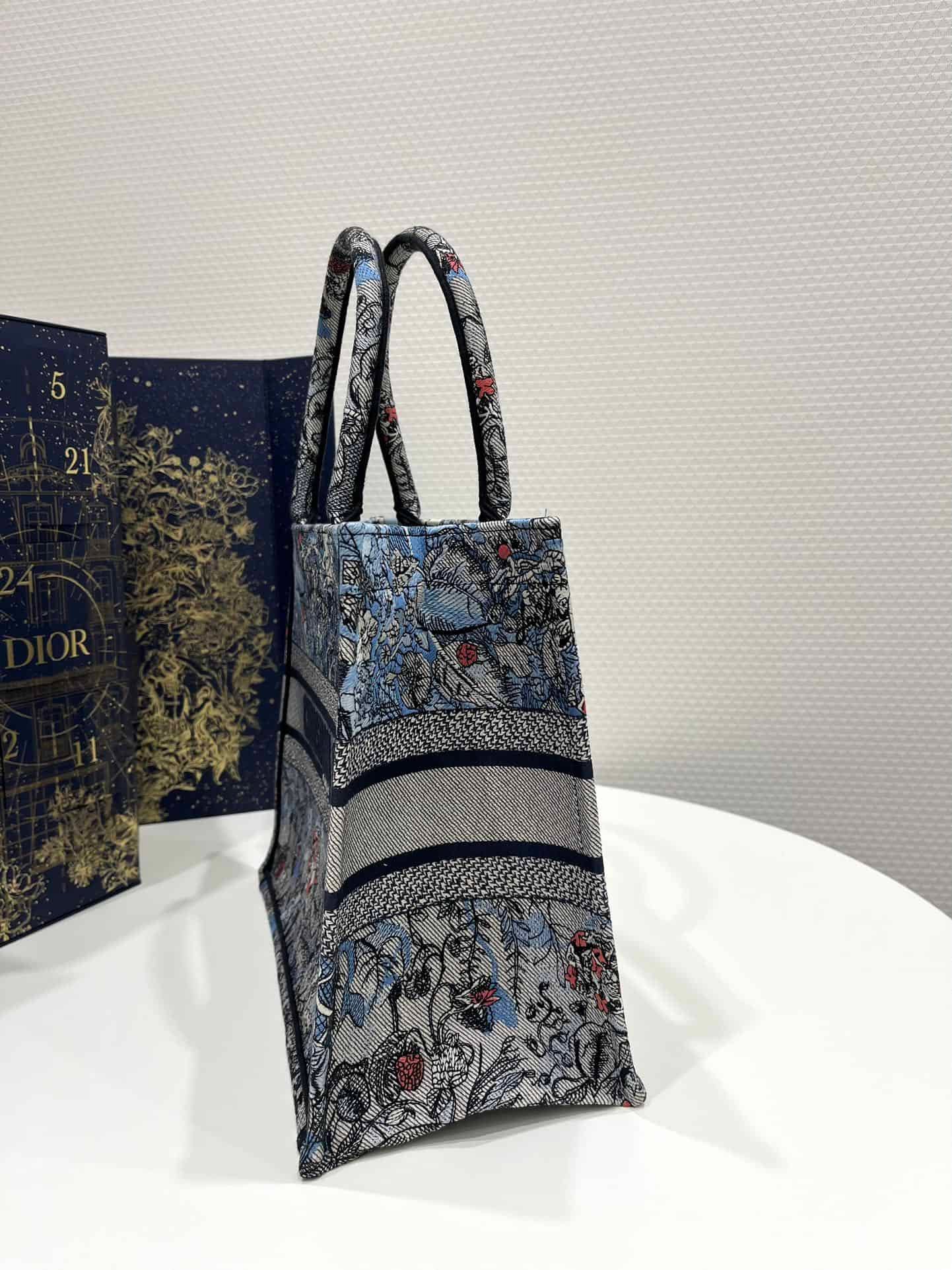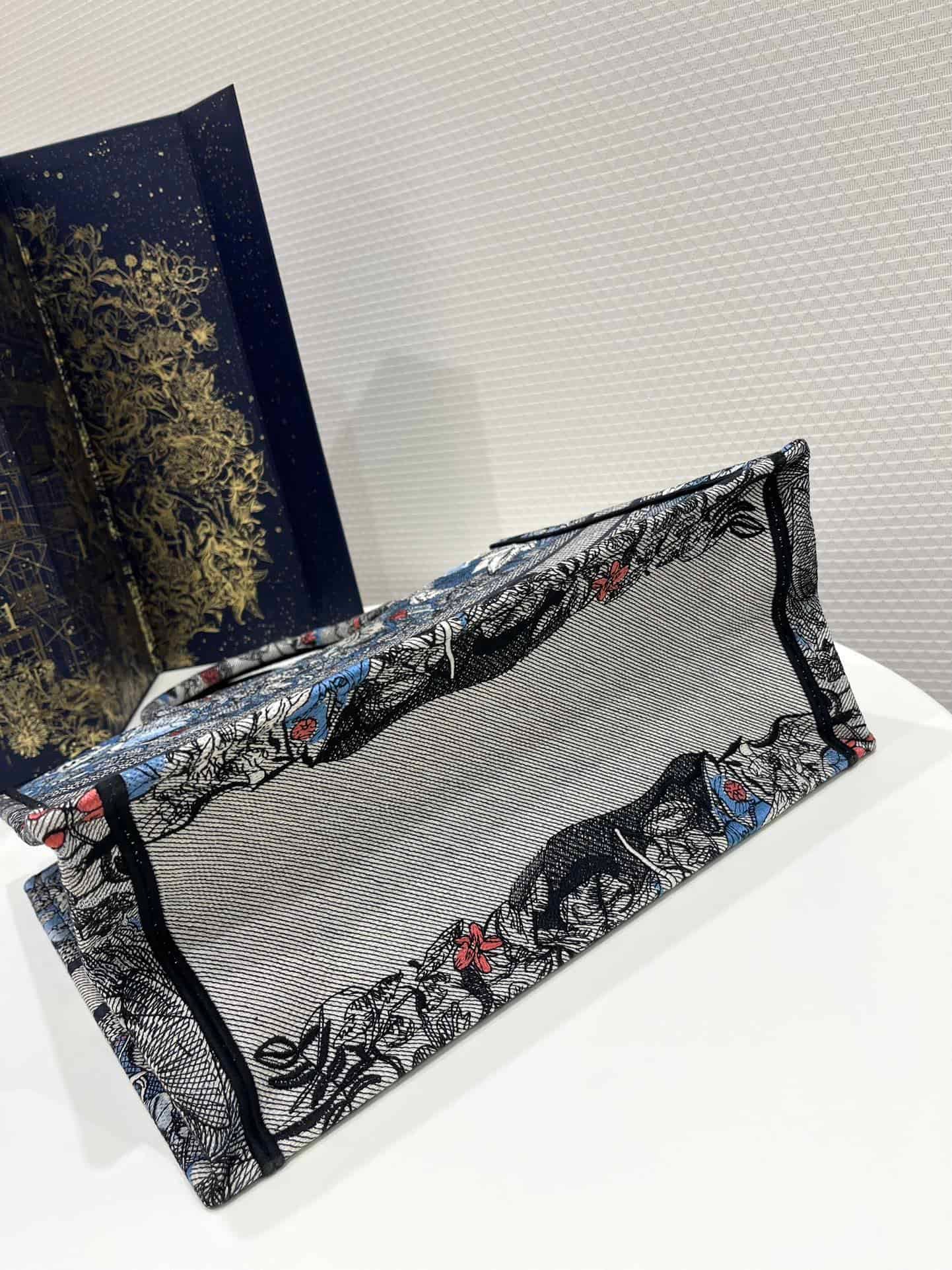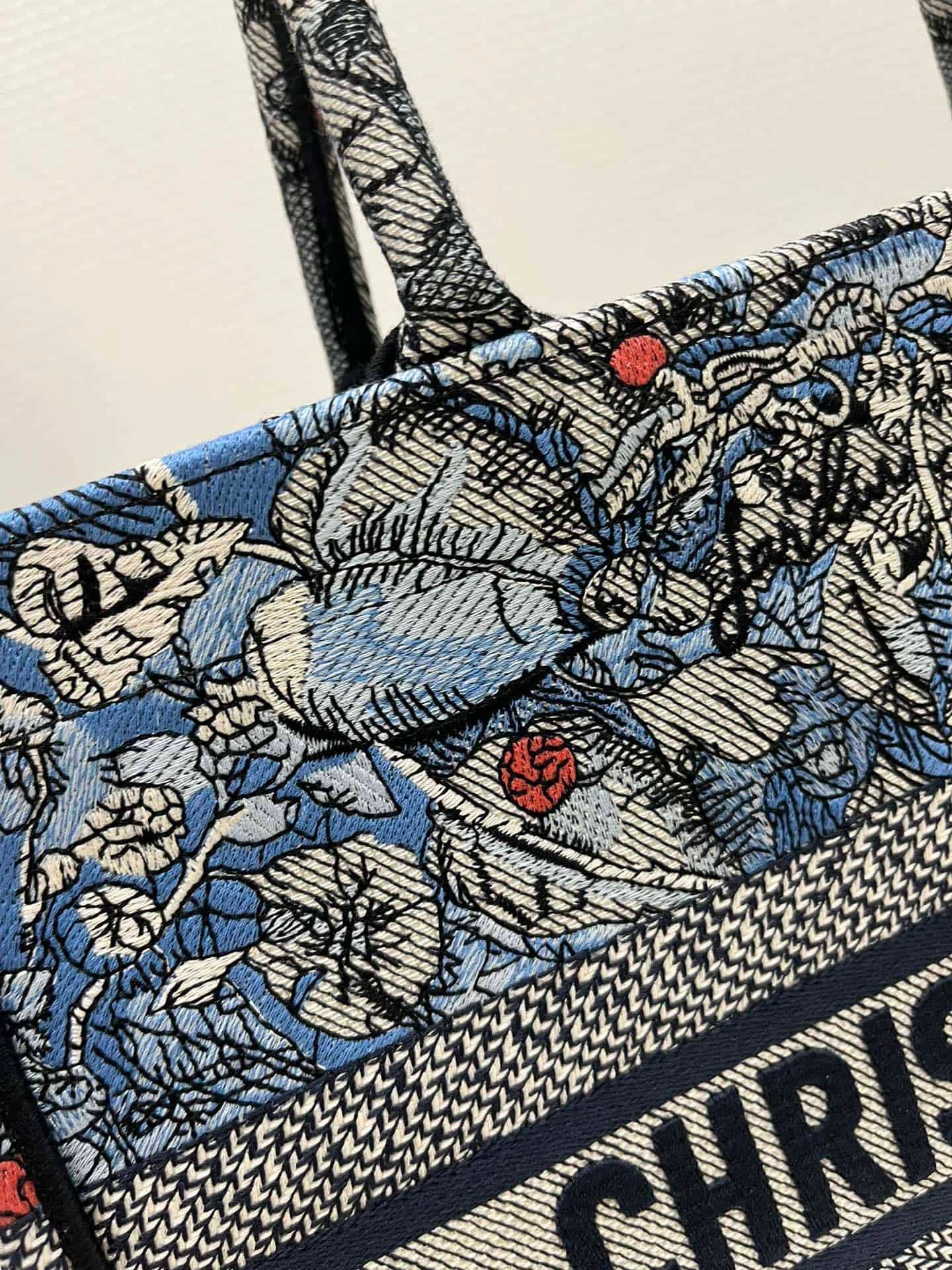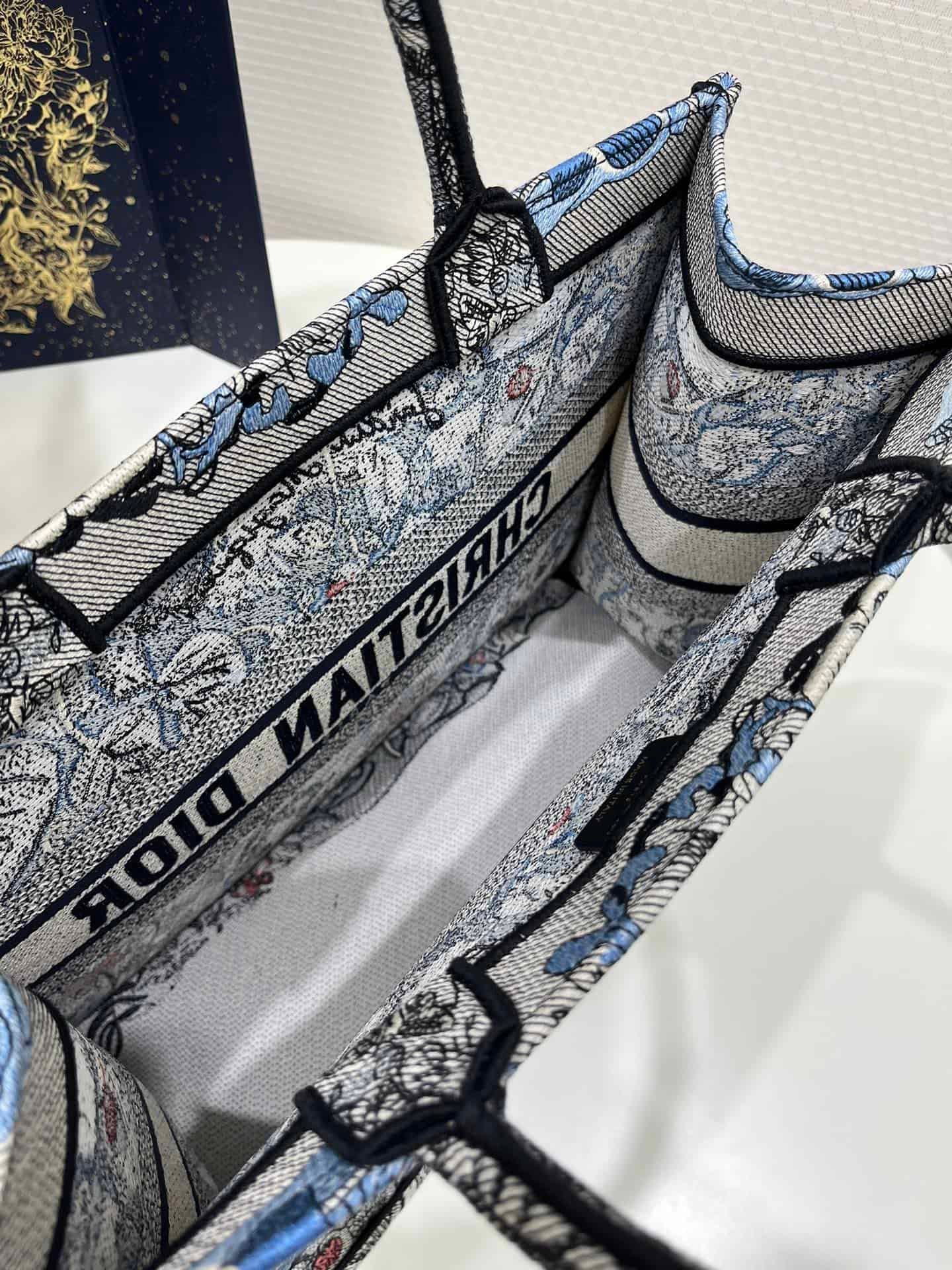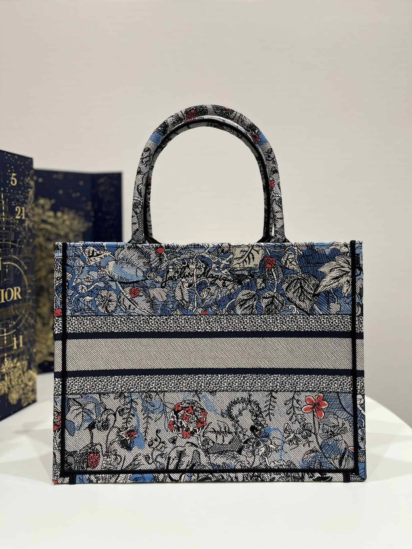 Introduced by Maria Grazia Chiuri, Dior’s Creative Director, the Dior Book Tote has become a staple of the Dior aesthetic. Designed to hold all the daily essentials, the style is fully embroidered with the denim multicolor Dior Jardin Magique motif, a bucolic and enchanting creation inspired by a magical world. The design is adorned with the ‘CHRISTIAN DIOR PARIS’ signature on the front and exemplifies the House’s signature savoir-faire. The medium tote may be carried by hand or worn over the shoulder.