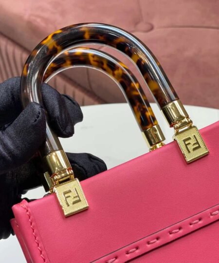 FD Sunshine Mini Shopper Bag is made of Pink with hot-stamped FENDI ROMA and stiff tortoiseshell-effect plexiglass handles. Features a lined internal compartment, tone on tone edges and gold-finish metalware. Can be carried by hand or worn on the shoulder thanks to the two handles and thin adjustable detachable shoulder strap