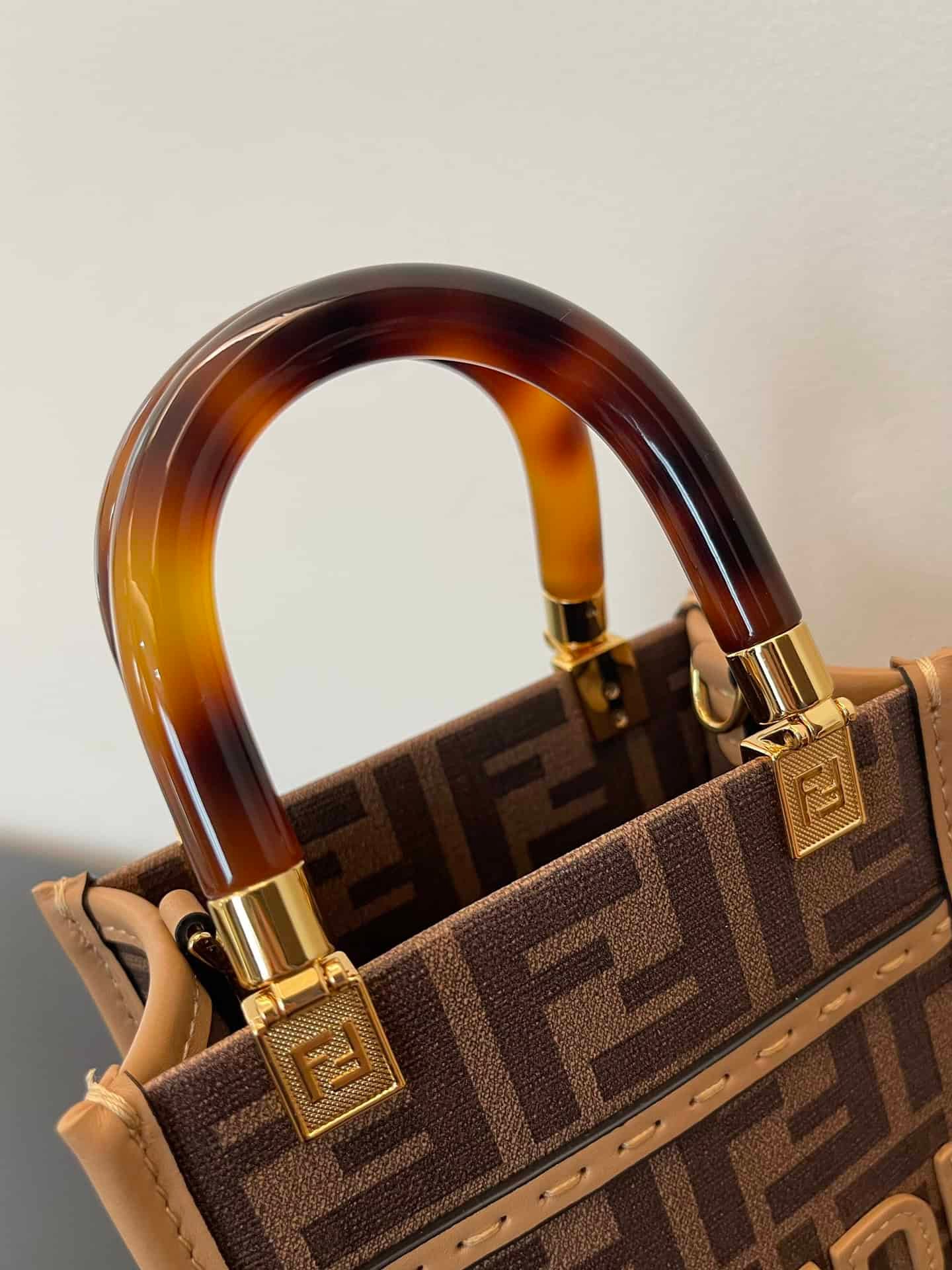Mini Sunshine Shopper bag made of brown FF jacquard motif fabric with stiff tortoiseshell-effect plexiglass handles.