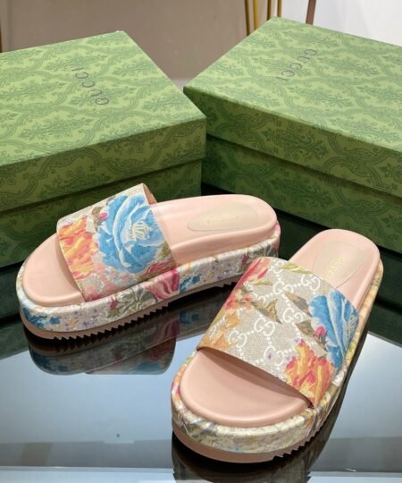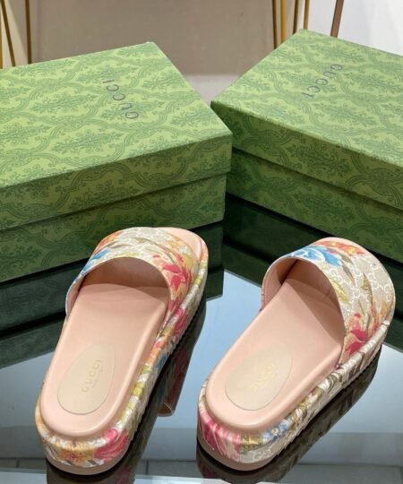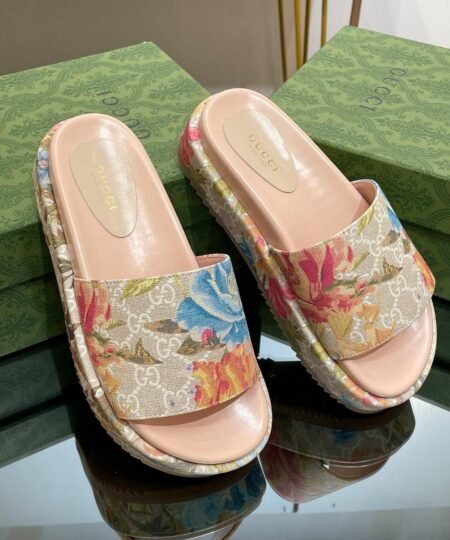 Gg Flora Slide Sandal with historical Flora motif from the 1960s was designed by artist Vittorio Accornero. Here it enriches a contemporary flatform slide sandal, while the light pink insole adds an inherently vintage touch to the style.