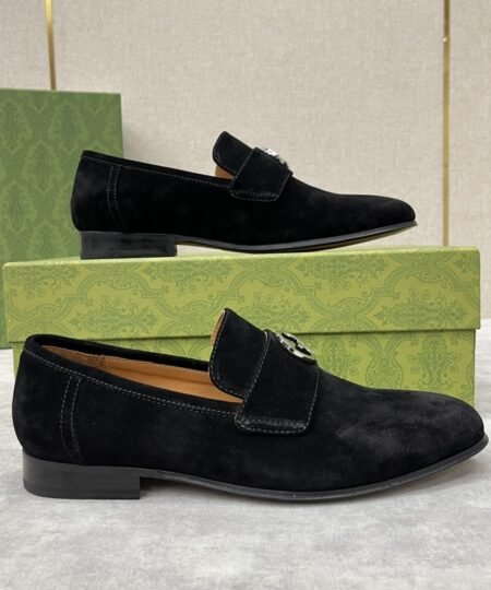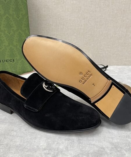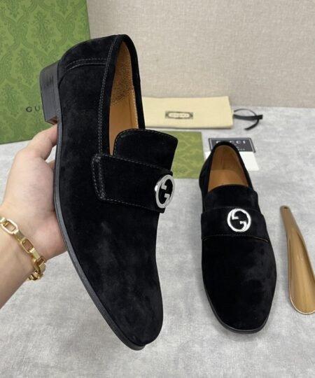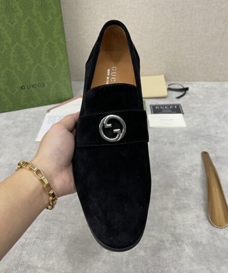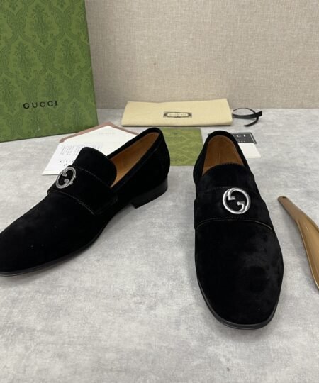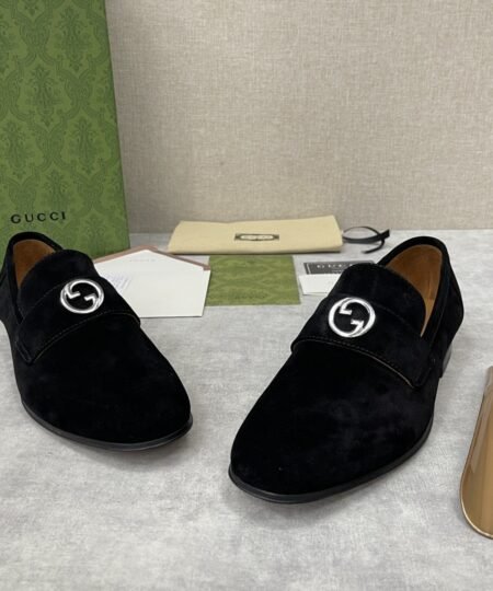 - Coming from the House’s archives, a geometrically shaped version of the Interlocking G logo continues to enrich the latest selection of accessories. The hardware adds a refined vintage feel to this black loafers, enriching the design with a timeless feel