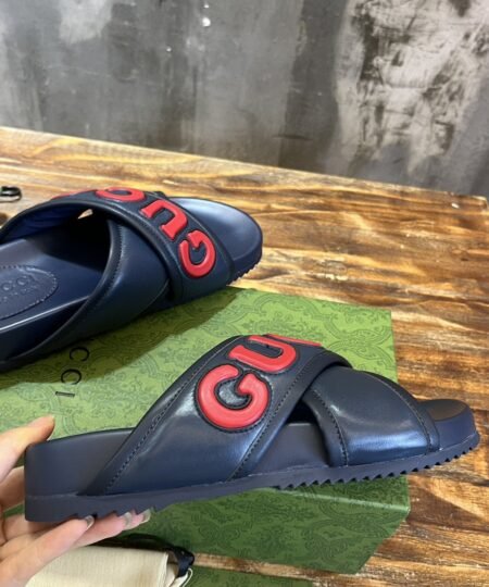 - Presented in smooth blue with a minimalist design, this sandal is further enriched with a contrasting Gucci script across the crossover. The buckle strap closure hugs the contours to ensure comfort whilst maintaining a sleek aesthetic..