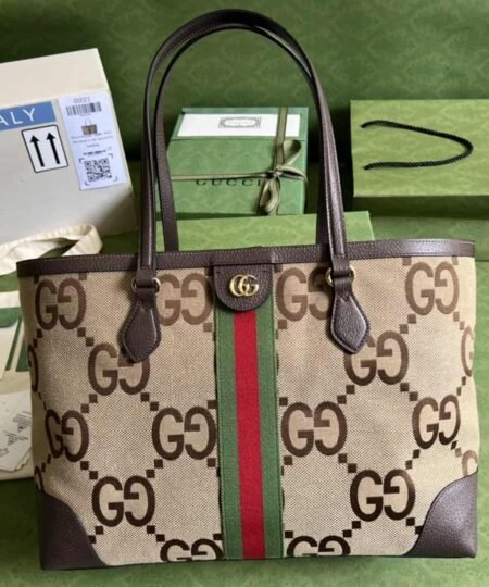 Gucci Ophidia Jumbo GG Medium Tote Camel And Ebony Jumbo Canvas For Women 15in/38cm 631685 UKMDG 2570