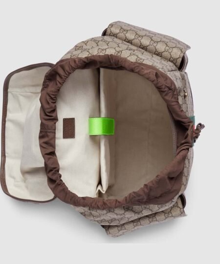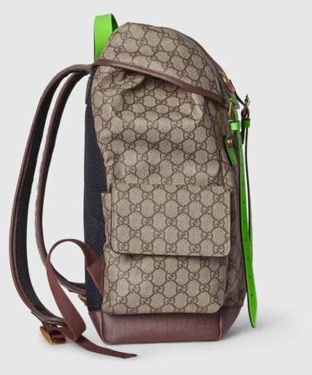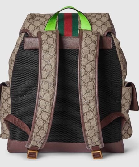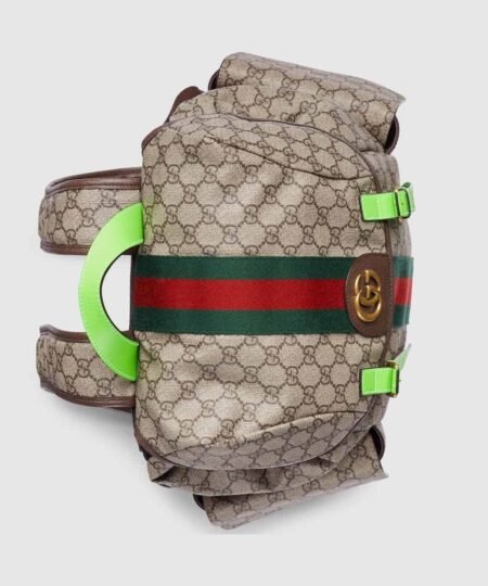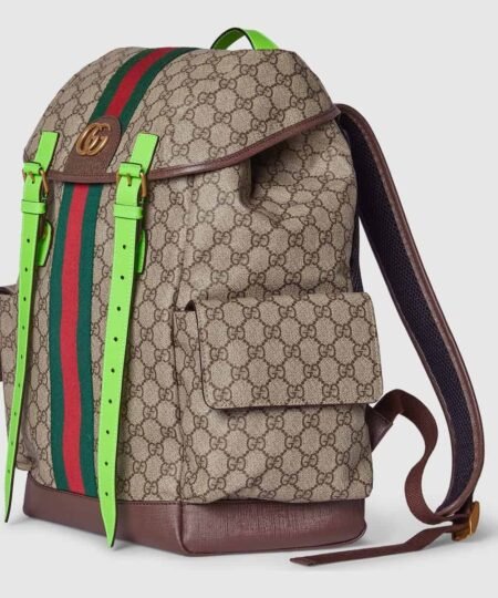 - Reflecting the Creative Director’s contemporary vision, the Ophidia lines come to life with a pop of fluorescent green. Combining the GG motif and Web stripe with a modern hue launches signature travel pieces into the metropolis, such as this backpack complete with side pockets.
