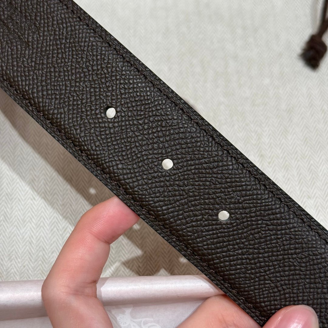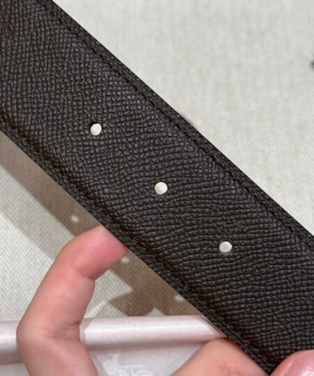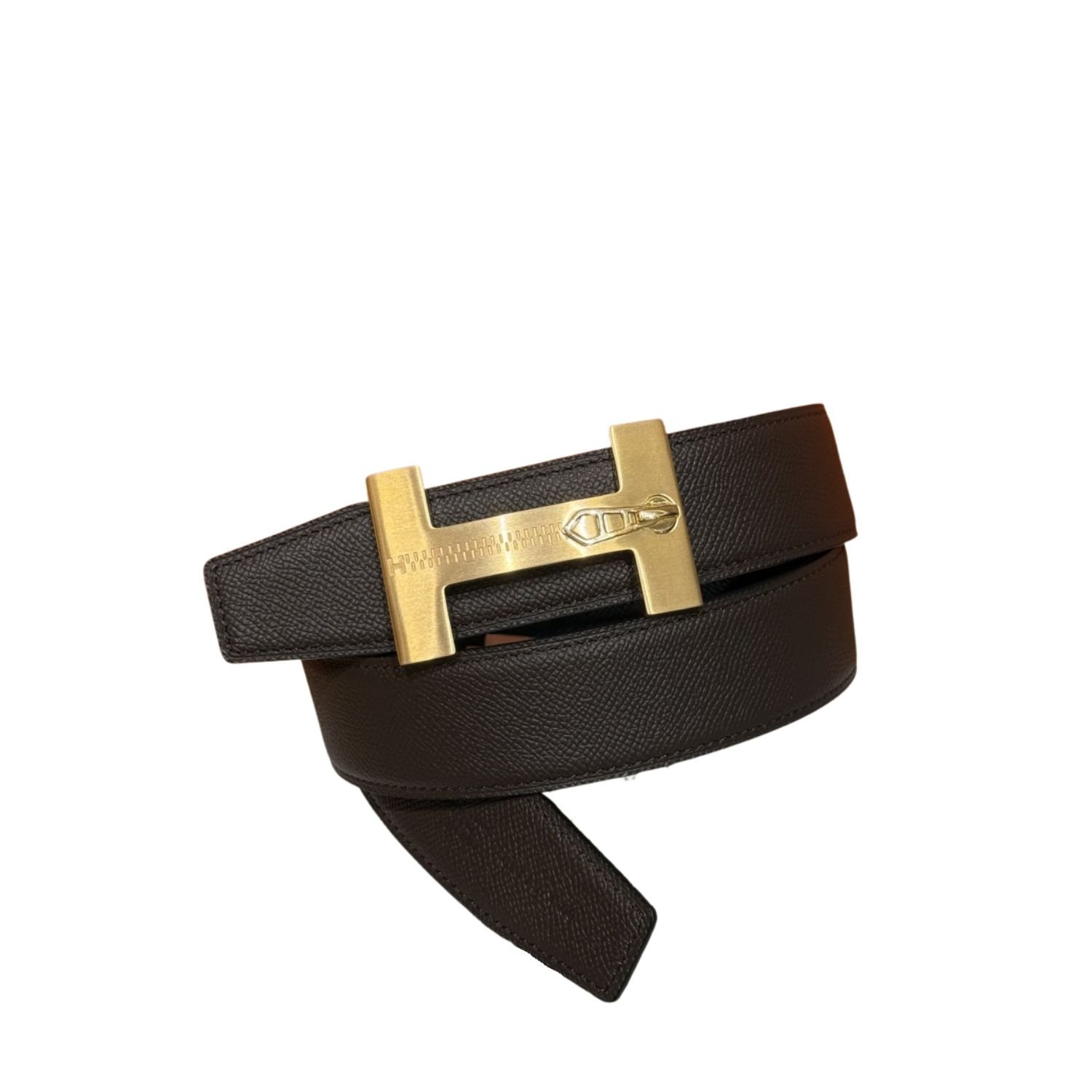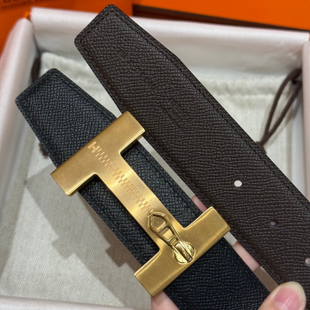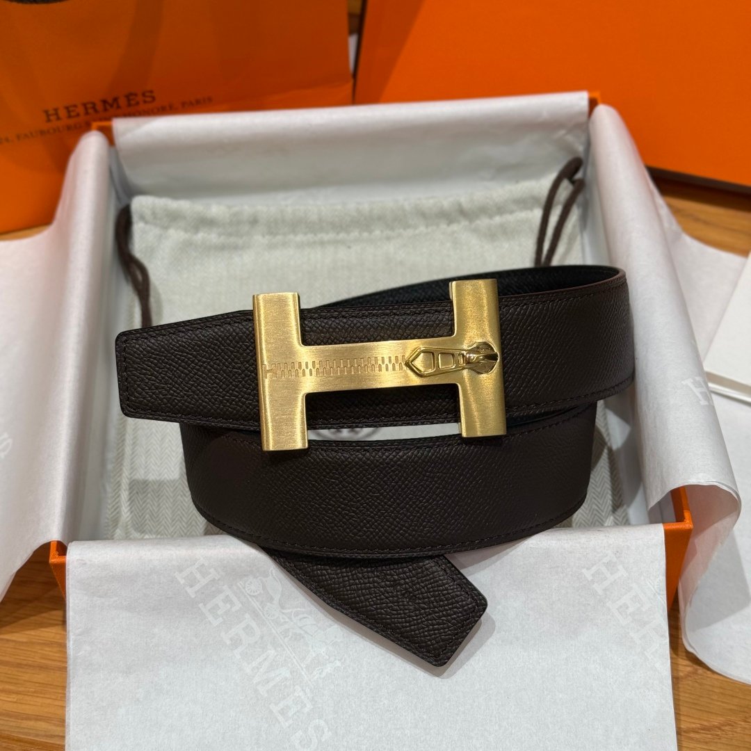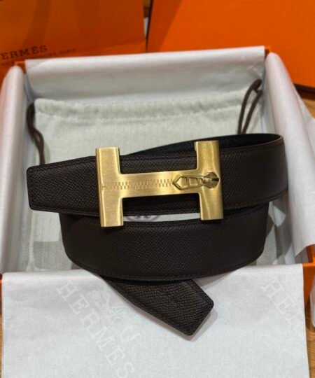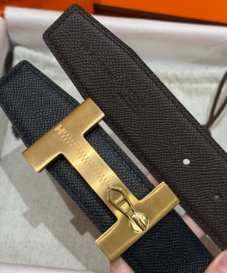 A refined take on Hermès’ iconic “H” belt, this piece stands out with its zipper-inspired buckle detail in brushed gold, it features a reversible design: classic black on one side, and rich green on the other.