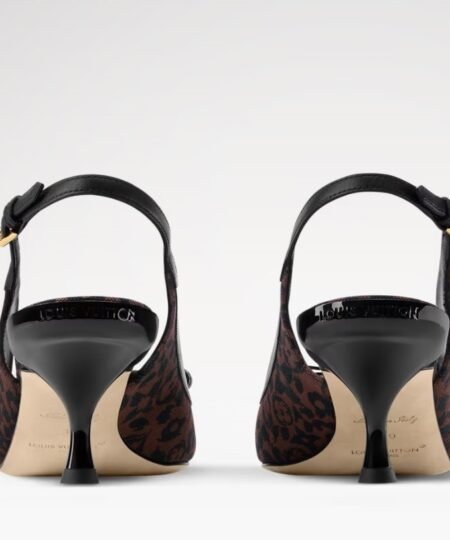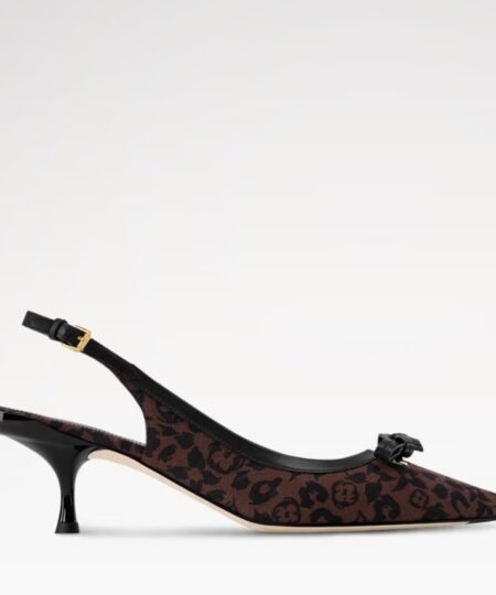 The 6AM slingback pump is revisited this season in Monogram Leopard-print canvas. This chic, feminine style, which is embellished with a leather bow and metal studs, has a pointed toe and an easy-to-wear kitten heel. The back strap is adjusted with a neat buckle in gold-toned metal.