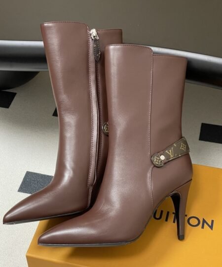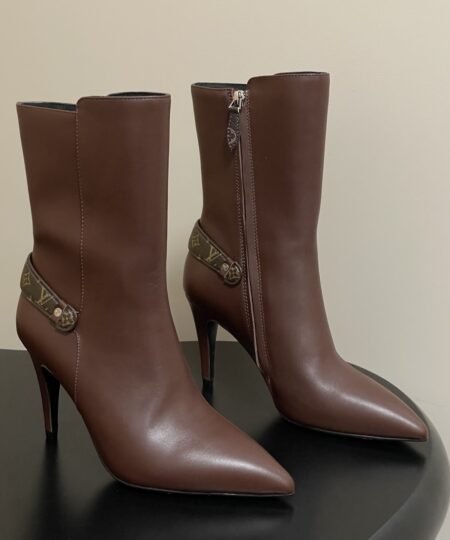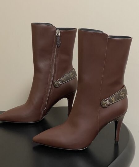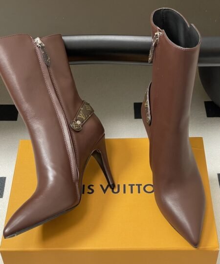 The Berlin open-toe ankle boot is a striking design with its sensual open toe, it is distinguished by its full-length laces, which go all the way up the front, ending with hiking boot-style hooks. This model is finished with a high block heel and a back loop in Monogram canvas.