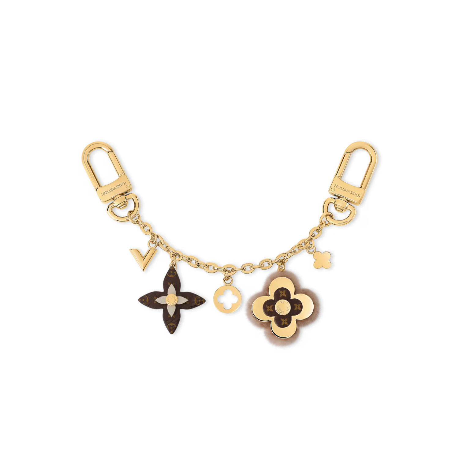 With its elegant style and exquisite details, the Blooming Flowers chain bag charm brings an aura of glamour and refinement to any handbag. Its gleaming gold-colored chain holds an array of Louis Vuitton emblems, including a finely crafted Monogram Flower edged with plush mink fur. Three more flowers and a signature V add an extra House touch.