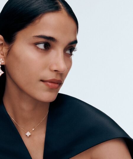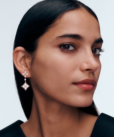 Meticulously fashioned from 18-karat pink gold, the Color Blossom Double Star earrings are richly set with brilliant diamond pavé. The iconic Monogram Flower motifs that adorn the delicate drops are carved from pristine white mother-of-pearl. Irresistibly feminine, these jewels cast a dazzling light with every graceful movement of the head.