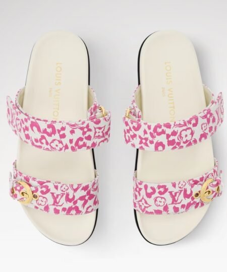 The Bom Dia comfort mule is revisited in Monogram Leopard-print canvas, a key motif of the season. This model is notable for its two adjustable straps: one fastens with a gold-toned buckle, the other, which bears the LV Initials signature, with velcro. It is finished with a comfortable anatomic footbed and a supple rubber outsole.
