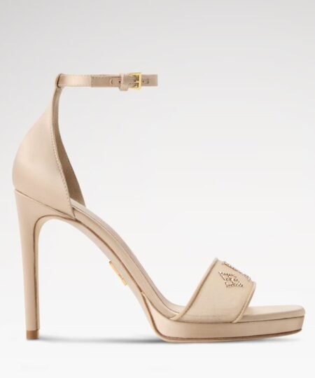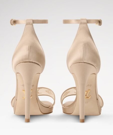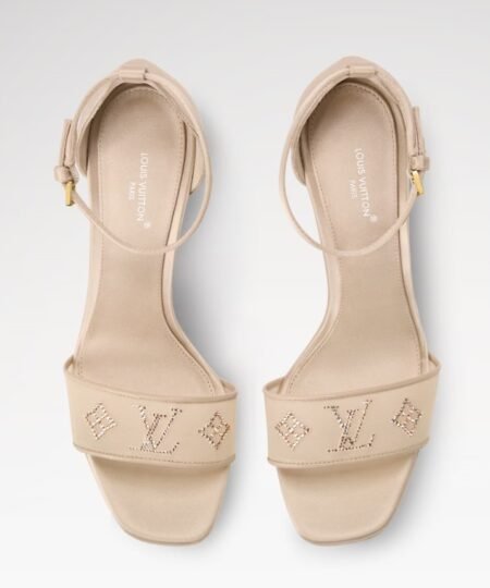 The Gala platform sandal is a sophisticated style with a front strap in translucent mesh, on which glittering rhinestones recreate the Louis Vuitton Monogram pattern. A slender ankle strap, adjusted with a tiny buckle, adds to the elegance of this design, which balances a high stiletto heel with a small platform.