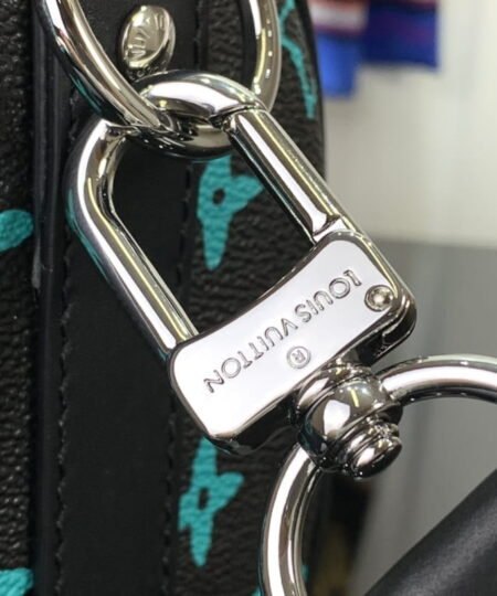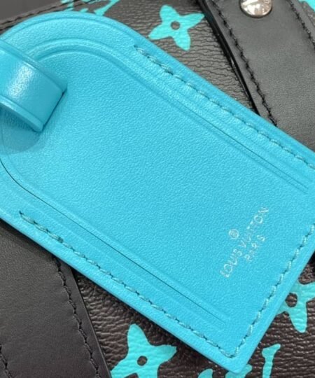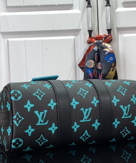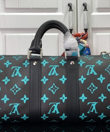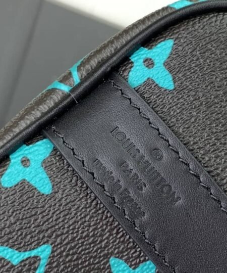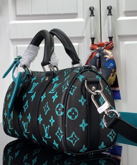 The compact Keepall Bandouliere 25 bag is fashioned from Monogram Macassar coated canvas with side bands in a lively. The hardware, including the rivets just below the handle mounts, is a matte black. A wide textile strap, with a woven tone-on-tone Louis Vuitton pattern, enables shoulder and cross-body carry.