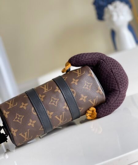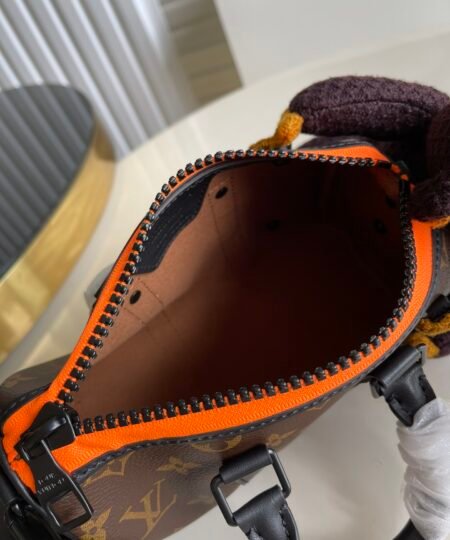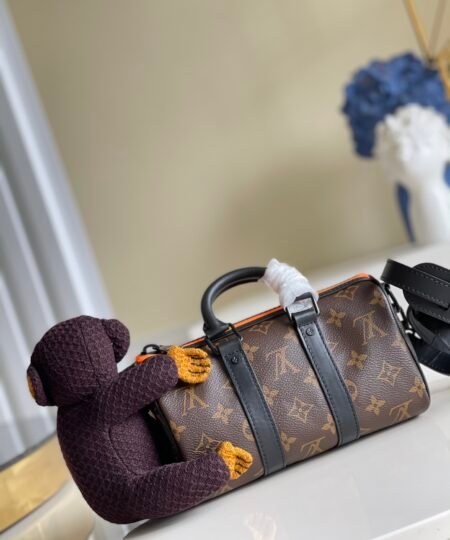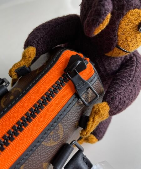 For the Spring-Summer 2021 Collection, Virgil Abloh unveils the Keepall XS bag, accessorized with a knit puppet of an LV friend from his Zoom with friends animated film. This small but functional bag is made from Monogram canvas, finished with matte-black. A touch of florescent orange along the edges of the zipper spices things up.