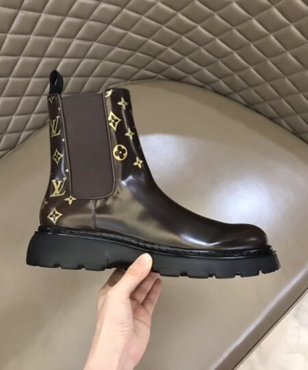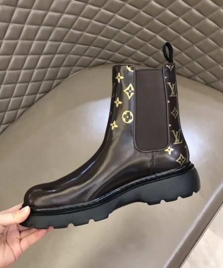 - The LV Bold Chelsea boot comes in glazed printed with a gradient Monogram pattern. This model is characterized by its sturdy yet lightweight micro outsole, which incorporates the LV Initials and Monogram Flowers in its tread. A Louis Vuitton textile back loop and elastic side panels ensure easy fitting.