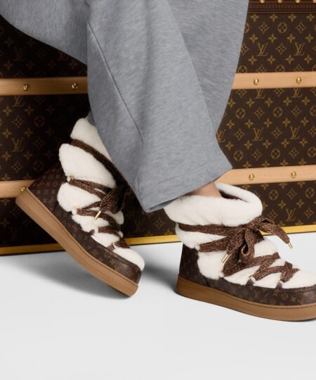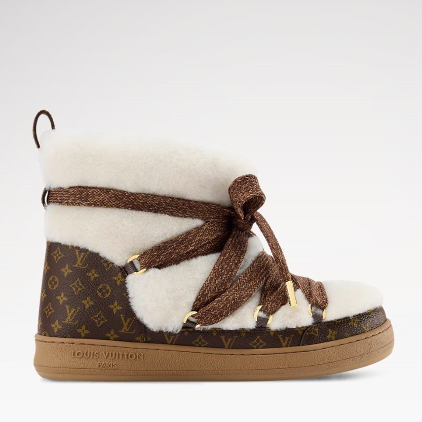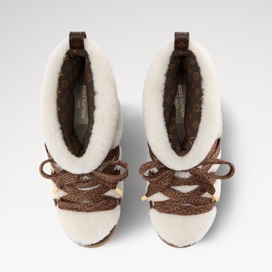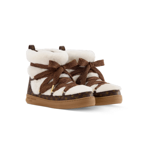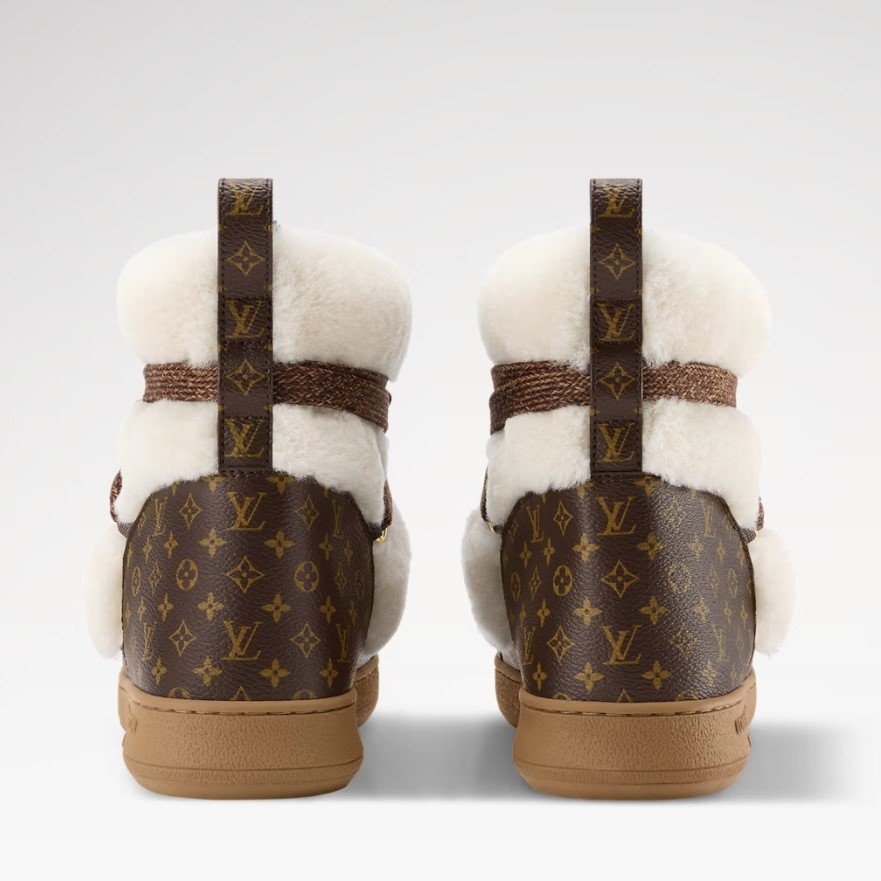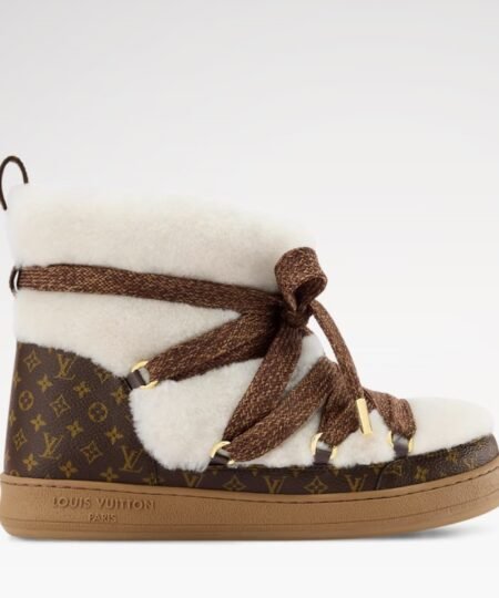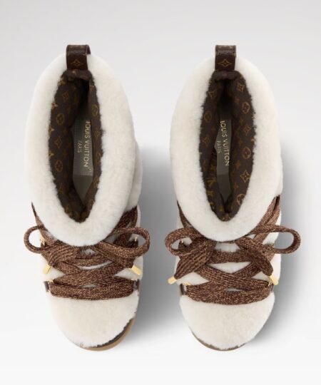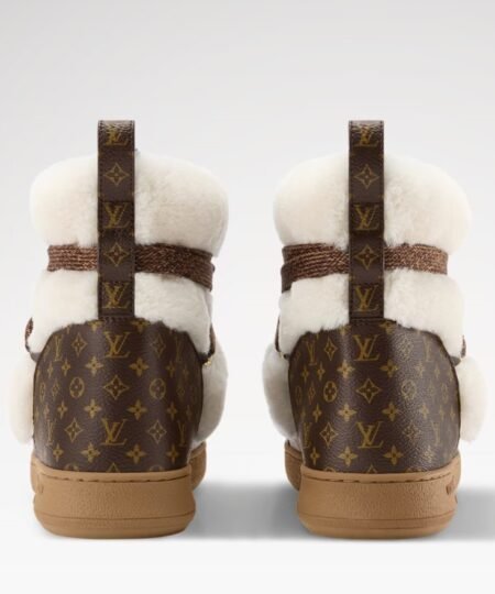 The LV Cloud lace-up ankle Boots sneaker teams snug shearling with iconic Monogram canvas for warmth, comfort and a striking signature look. This stylish model, which belongs to the LV Ski capsule, will transition effortlessly from the slopes to city streets. It features crisscrossing laces with gold-toned eyelets and a rubber outsole with the Louis Vuitton signature.