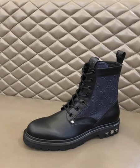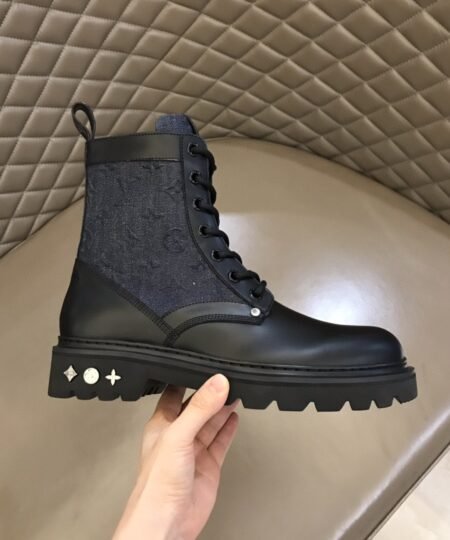 - The LV Ranger ankle boot is a military-inspired design in glazed and Monogram denim. Metal eyelets and thick textile laces complement this model, which is signed with the LV Initials on the tongue. The chunky, treaded outsole in ultra-light micro is decorated with Monogram Flower motifs.