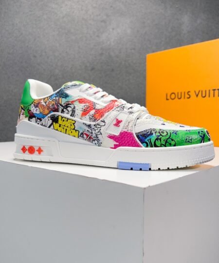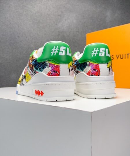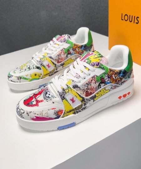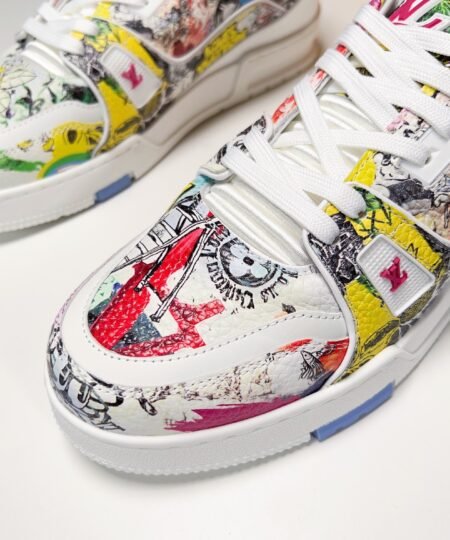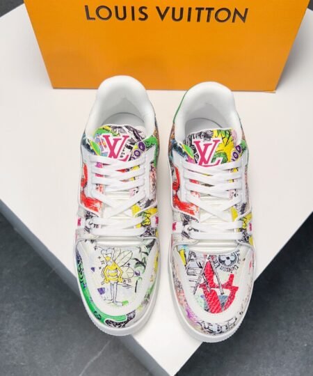 - This version of the LV Trainer sneaker comes in canvas printed with Louis Vuitton comic motifs inspired by the Spring-Summer 2023 men’s show. Designed by Virgil Abloh, this cult model references vintage basketball sneakers. It is signed with the LV Initials, Monogram Flowers and the #54 logo, referring to 1854, the date the House was founded.