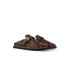The sleek design of the LV Vibe slingback pump is notable for its pointed toe and high, leather-covered heel, as well as for its distinctive details: a decorative, belt-like strap in Monogram canvas at the front and a silver-toned chain and engraved studs on the elasticized back strap.