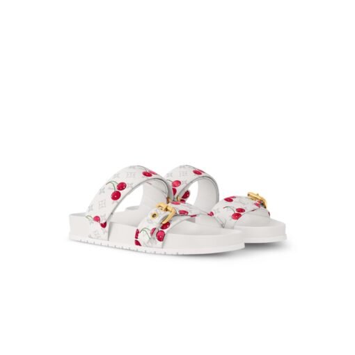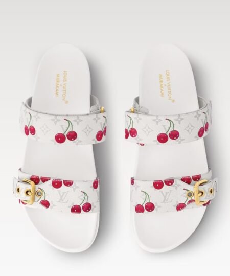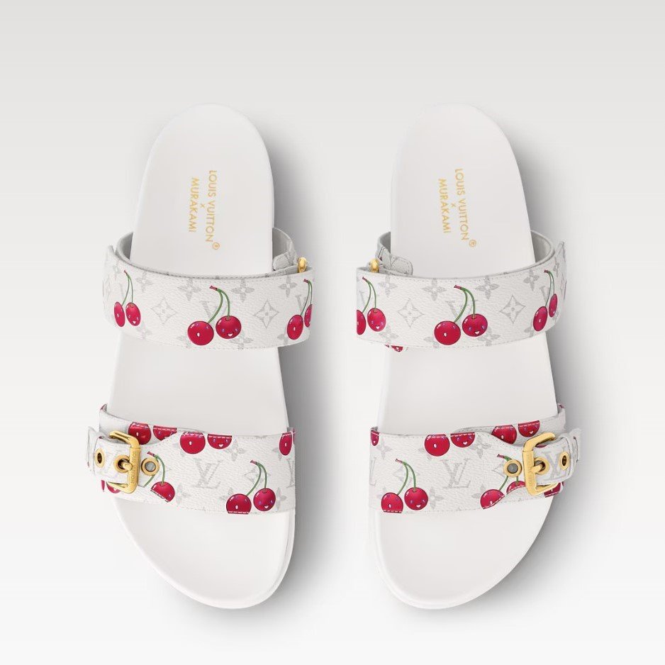 The staple Bom Dia flat comfort mule is elevated into a chic statement as part of the celebratory second edition of the Louis Vuitton x Takashi Murakami collection. Crafted from classic Monogram canvas layered with vibrant cherry motifs, one strap is effortlessly adjusted with velcro, while the other is fastened with a gleaming golden buckle. Complete with an anatomic insole and slip-resistant outsole for casual everyday wear.