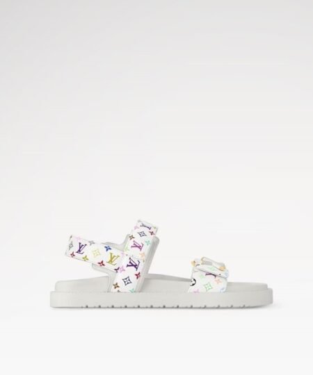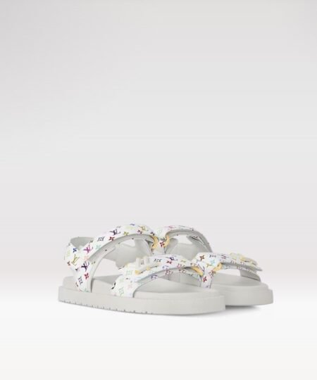 Striking signatures from the re-edition of the Louis Vuitton x Murakami collection reimagine the LV Sunset flat comfort sandal as a playful everyday statement. Crafted from coated canvas, the iconic Monogram motif is accented with bright rainbow tones inspired by the exuberant aesthetic of Japanese artist Takashi Murakami, while the front strap is embellished with chunky LV Initials with golden touches. Complete with a calf-leather lining, an anatomic footbed and lightweight micro outsole for elevated comfort.