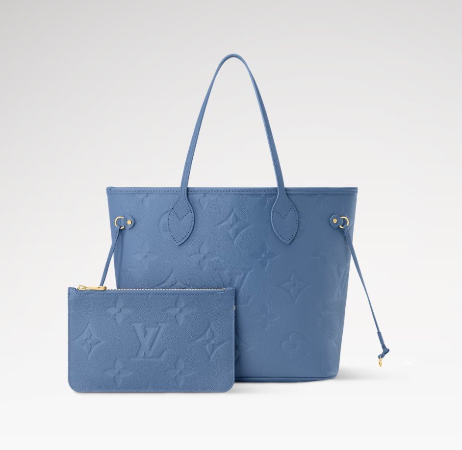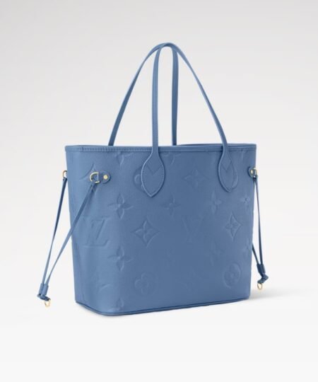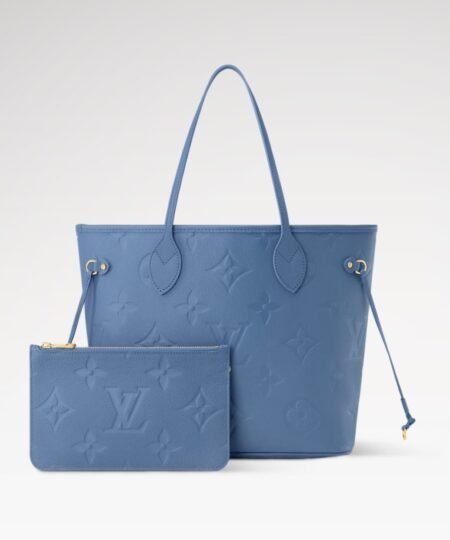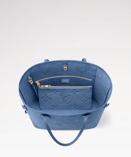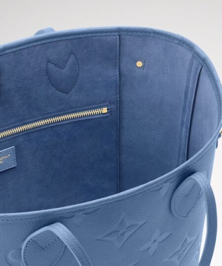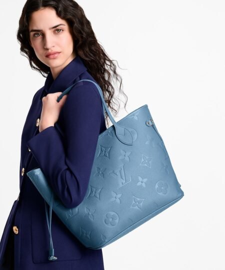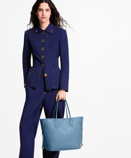 The Monogram Empreinte collection reimagines the timeless Neverfull MM tote in a sleek and refined Blue Denim colorway. This contemporary edition is crafted with the House’s emblematic signature and is adorned with elegant gold-toned hardware. It is fitted with side laces to cinch the silhouette and is sized to fit everyday essentials, including a laptop.