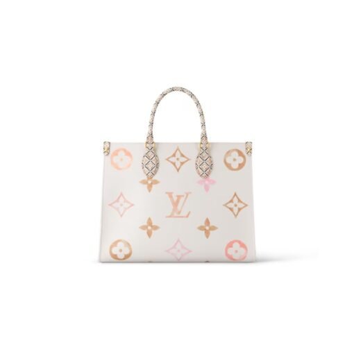 The OnTheGo MM tote bag is made from coated canvas with an oversized Monogram pattern on a cream-colored background. The bag?s trim and interior lining feature intricate Monogram Flower prints, inspired by traditional Portuguese azulejo tiles. The roomy interior and two sets of handles, long and short, make it a versatile everyday bag.