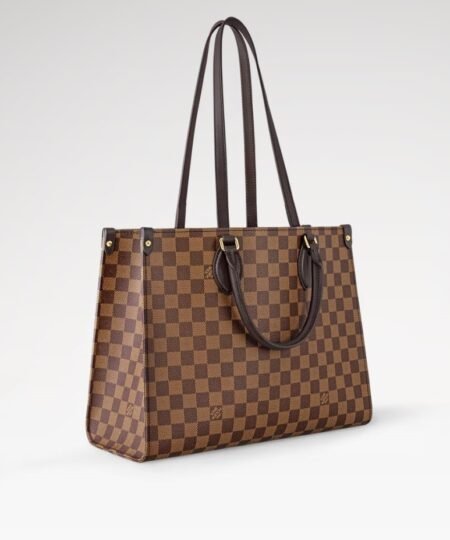 The classic OnTheGo MM handbag is reimagined for the season in Damier Ebene canvas. Accented with gold-toned hardware, it can be hand-carried by the top handles, or styled as a shoulder bag thanks to the longer handles. The sophisticated design is fitted with one interior pocket, and is generously sized to store a laptop as well as other daily essentials.