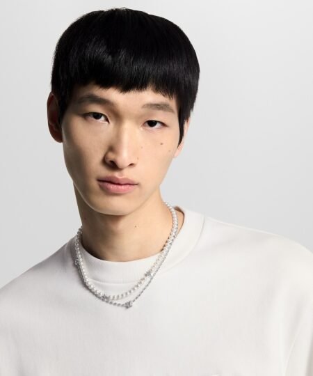 The perfect accessory for this season’s globe-trotting dandy, this Pearls Fusion Necklace brings an edgy, contemporary twist to a look. It features two stacked rows of glass pearls and silvery metallic beads, interspersed with meticulously engraved Monogram Flower and LV elements. An adjustable chain finished with a delicate LV charm secures this standout ornament.