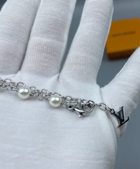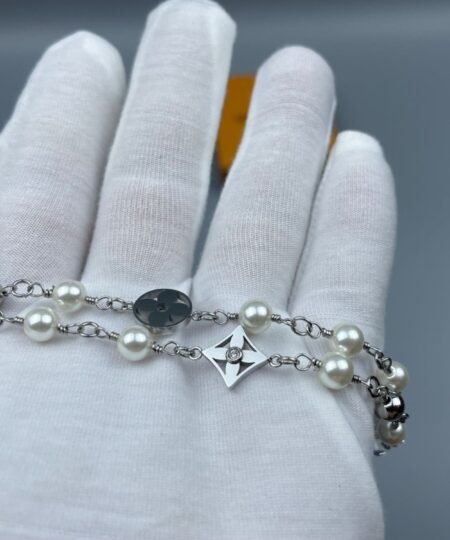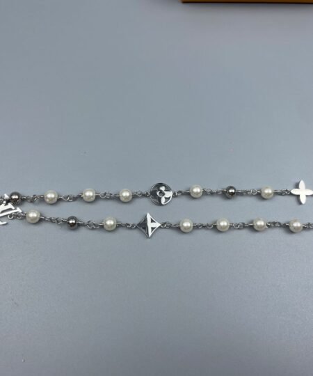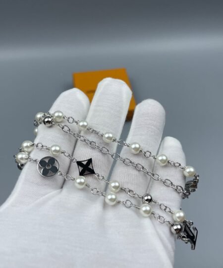 The LV Pearls necklace is a moody piece of jewelry that captures attention with its rich materials. Featuring a chain of pearls and House signature charms, the individual pieces are engraved with the Damier pattern.