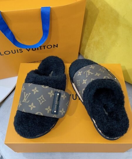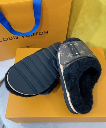 - This wintry edition of the Slipper Pillow flat comfort mule comes in eco-sustainable faux fur for instant warmth and comfort. A padded strap in Monogram nylon complements this design, which features an anatomic footbed and a lightweight micro outsole. The leather label on the upper is embossed in gold with the Louis Vuitton signature.