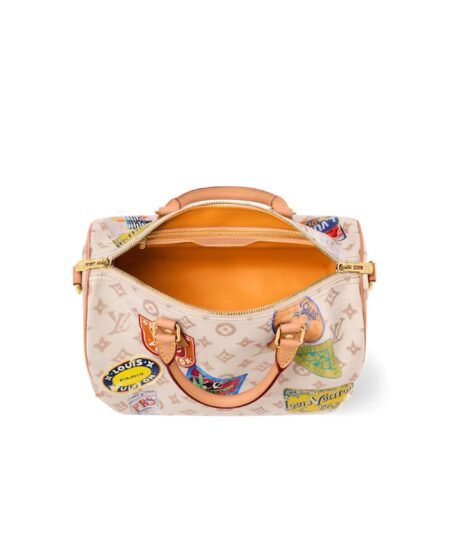 The perfect travel companion, it is decorated with an airplane charm and playful labels in a patchwork effect, which are taken from Gaston Louis Vuitton’s original collection. Attach the longer handle to wear it over one shoulder.
