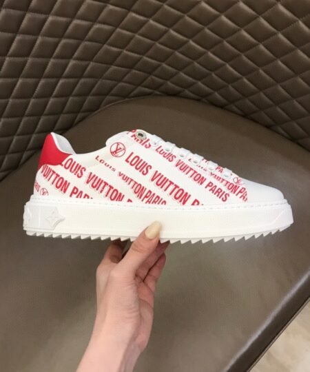 - This edition of the emblematic Time Out sneaker was inspired by Louis Vuitton’s Fall-Winter 2021 fashion show. Crafted from soft napa, it is printed with a new graphic signature. This model is characterized by its fashionable, elevated outsole.