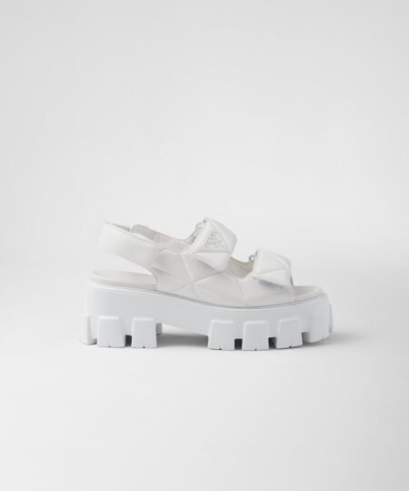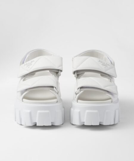 - These flatform sandals with a modern menswear-inspired silhouette are enhanced by the quilted detail that echoes the iconic shape of the Prada triangle. The sporty style made of nappa is enriched by the distinctive Monolith sole that combines important volumes with light rubber, becoming an expression of Prada’s dual soul.