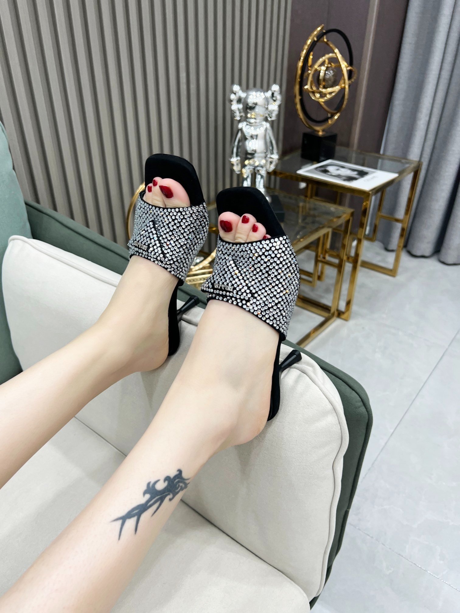 Faceted crystals create plays of light and iridescent reflections on a luxurious version of mid-heel slides. New variations of the brand’s iconic triangle logo turn it into a slightly padded detail.