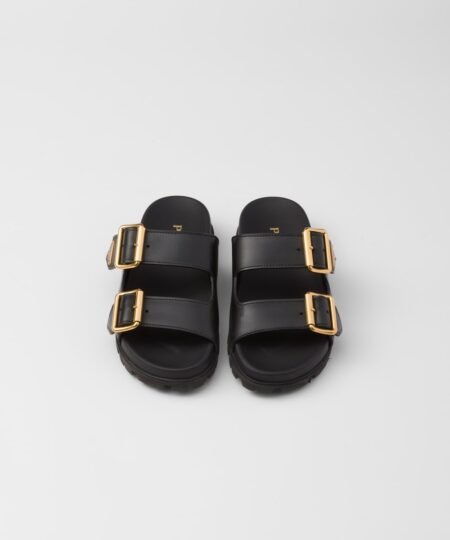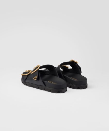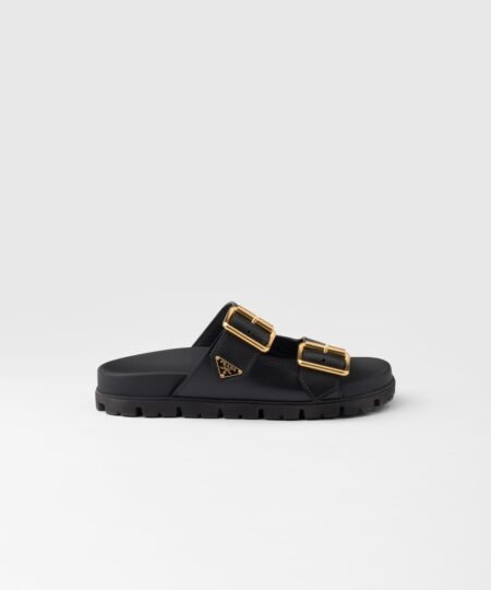 - These slides with a casual style are defined by clean, contemporary lines. This versatile footwear characterized by straps with metal buckles are completed by rubber soles with a lug tread. The enameled metal triangle logo embellishes the style with its sleek and iconic signature touch.