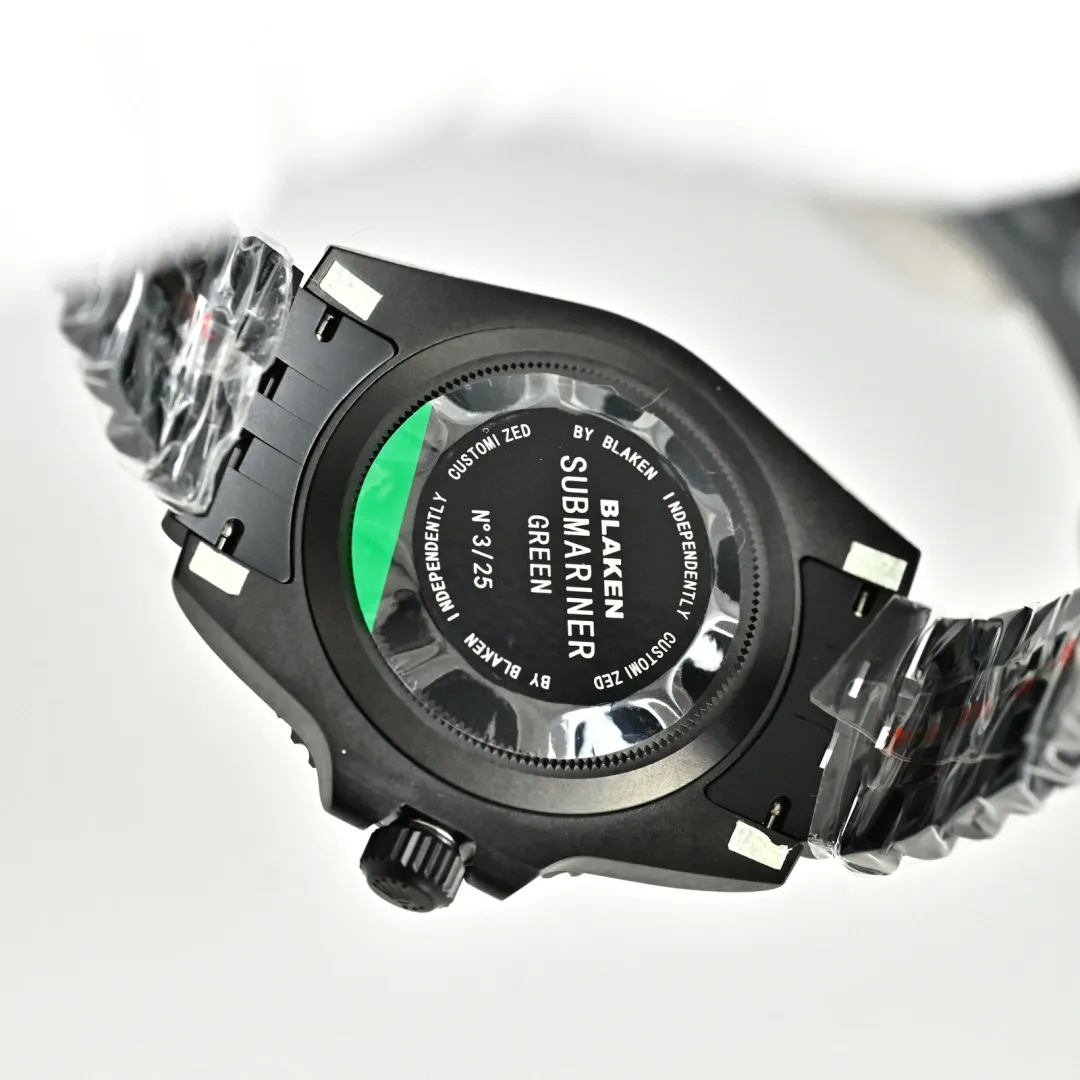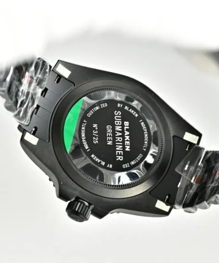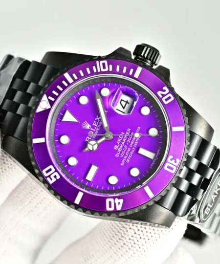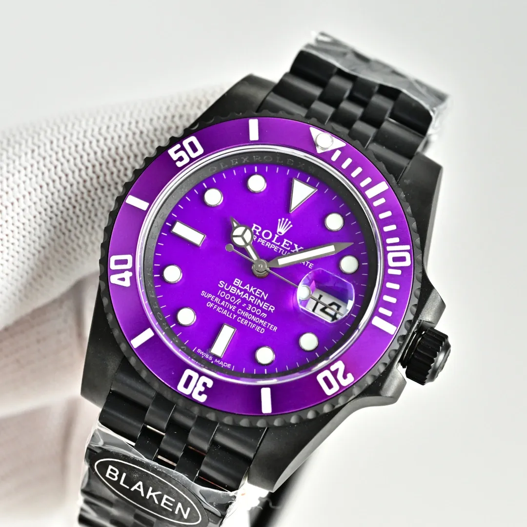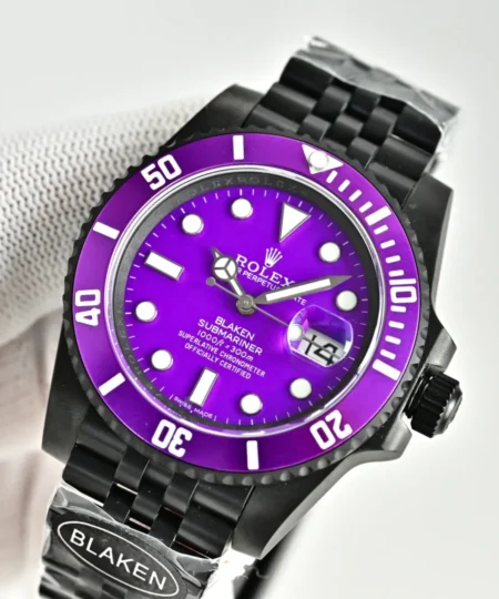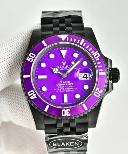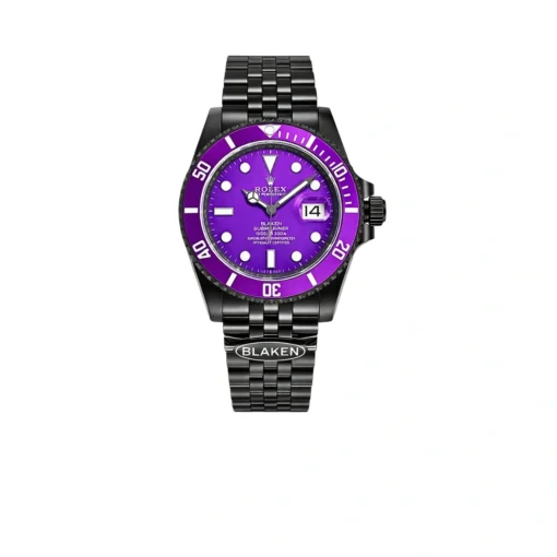 This Blaken-customized Rolex Submariner showcases a striking purple dial paired with a matching purple bezel, delivering a unique and eye-catching aesthetic. The matte black DLC-coated case enhances the vivid color contrast, while the white luminous hour markers ensure excellent readability.