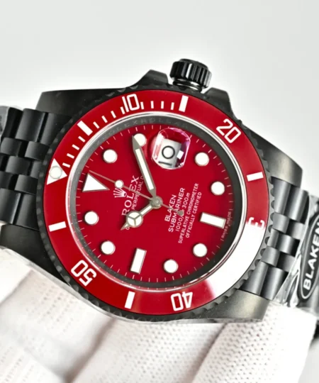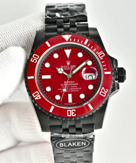This Blaken-customized Rolex Submariner features a rich red dial paired with a matching red bezel, giving the watch a bold and high-impact appearance. The matte black DLC case and bracelet enhance the dramatic color contrast, while the white luminous markers ensure excellent readability