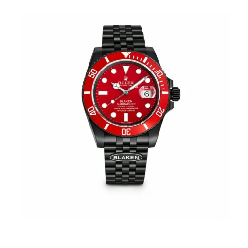 This Blaken-customized Rolex Submariner features a rich red dial paired with a matching red bezel, giving the watch a bold and high-impact appearance. The matte black DLC case and bracelet enhance the dramatic color contrast, while the white luminous markers ensure excellent readability