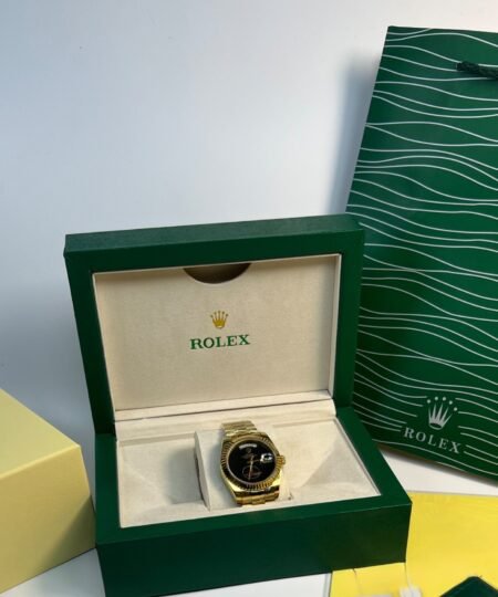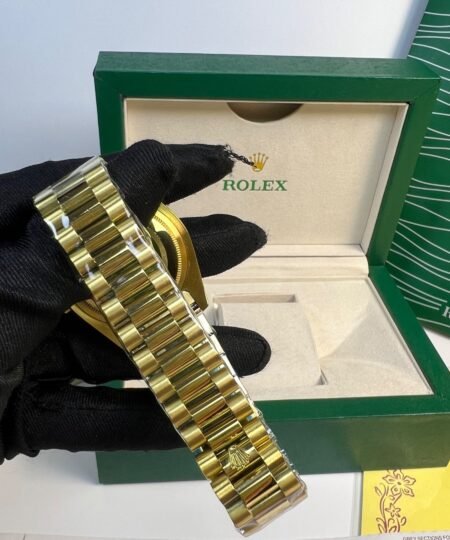 The Rolex Day-Date 36 combines timeless elegance with iconic design. Featuring a refined dial accented by gold-toned hands and markers, this 36mm timepiece offers a bold yet sophisticated look.