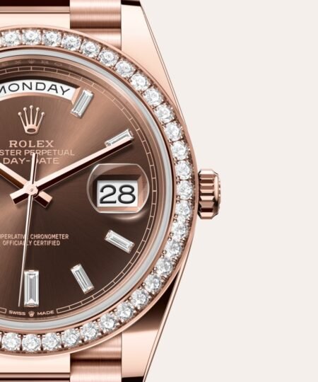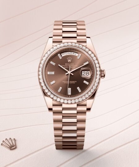 The Rolex Day-Date 40 combines timeless elegance with iconic design. Featuring a refined dial accented by rose gold-toned hands and markers, this 40mm timepiece offers a bold yet sophisticated look.